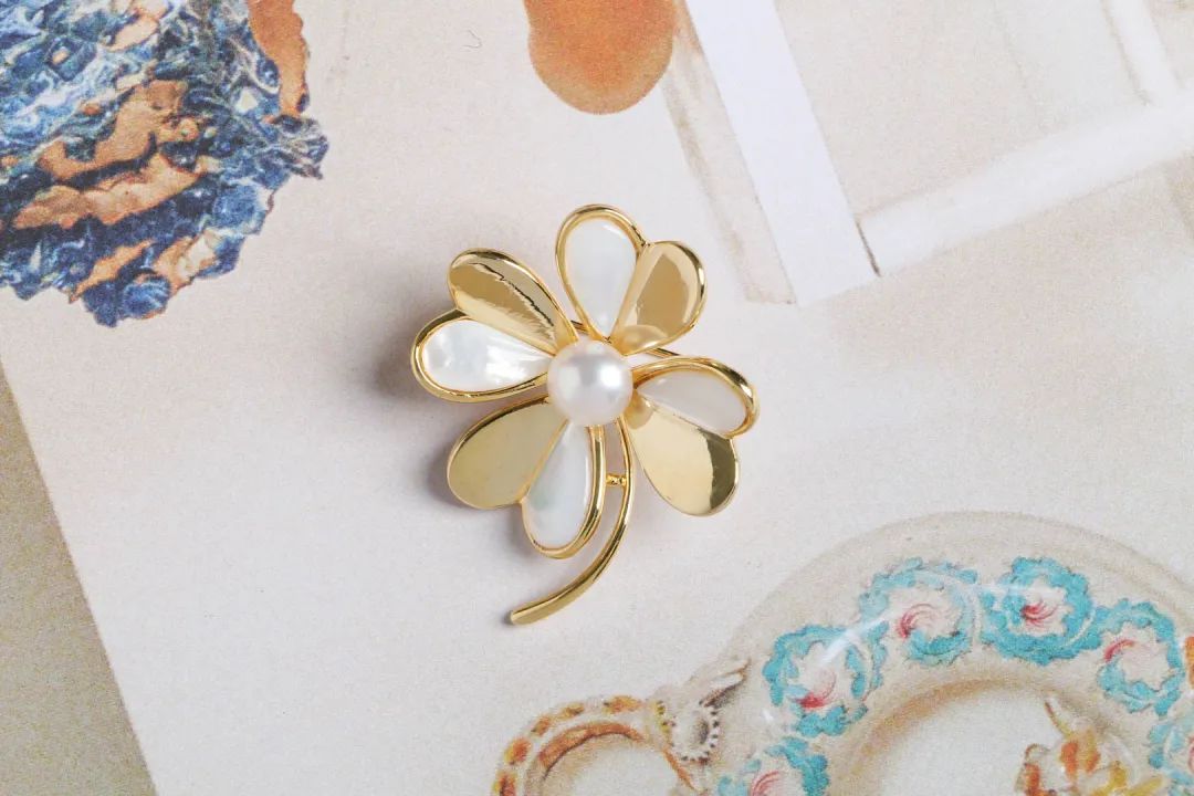 四叶草胸针,日本成品进口,4个半面海水贝壳,做工精致,一粒淡水珍珠。
