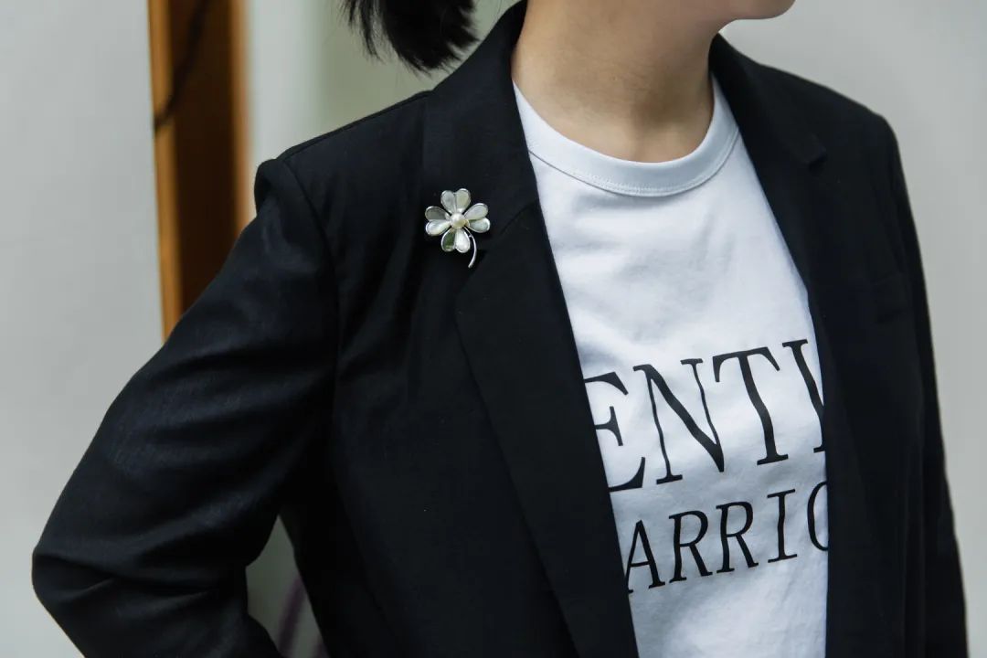 胸针半半四叶草,幸运的四叶草点缀胸口,带来好运气,一半的海水母贝装缀,温润浅浅的光泽与配件形成对比,所以更富有层次感,佩戴时从不同角度看都很特别。