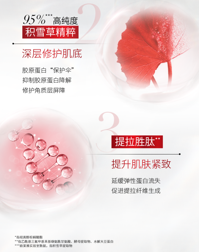 不仅如此,产品复配的成分也很有看点:积雪草精粹——帮助肌肤进行自我修护,减少皮肤皱纹的产生,让皮肤延缓衰老;基层提拉素——激活肌肤内部的提拉因子,令肌肤紧致上扬、充满弹性。