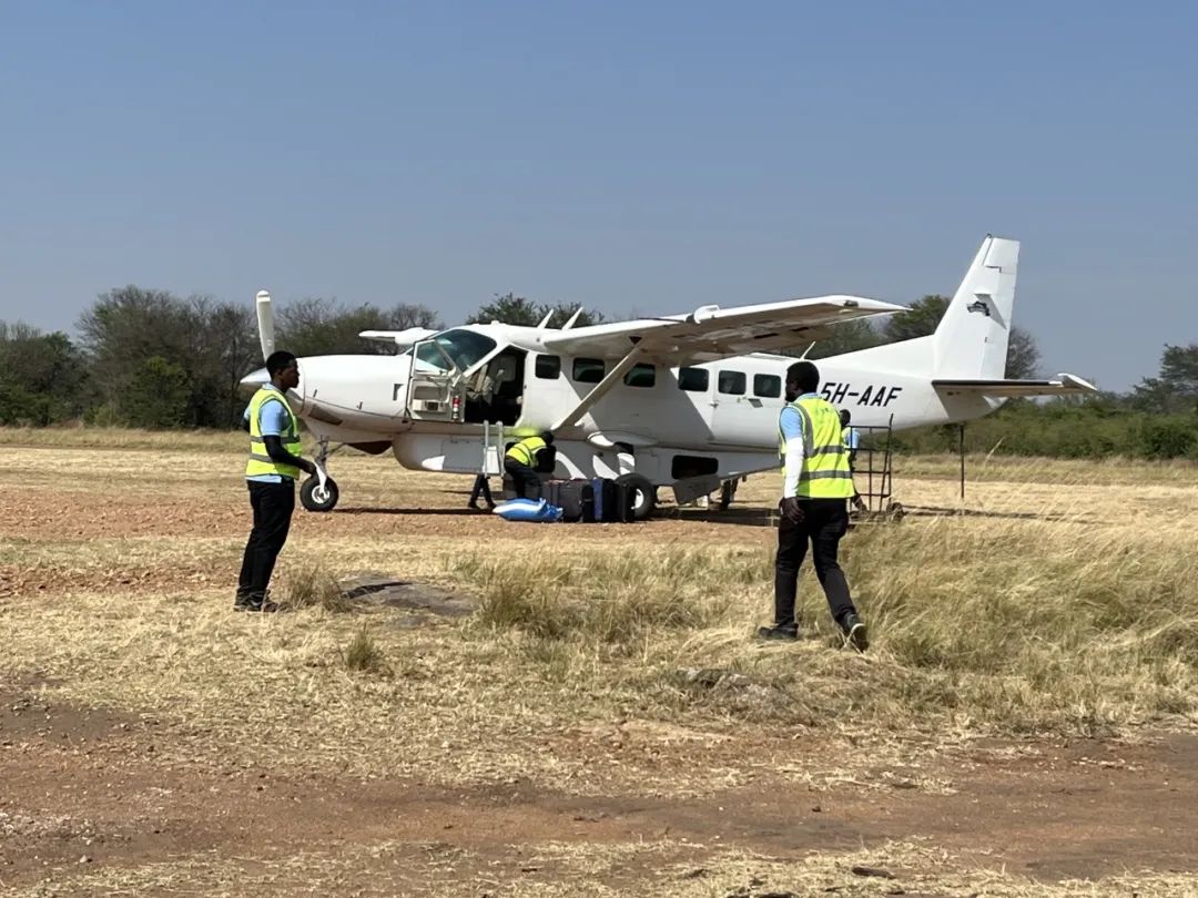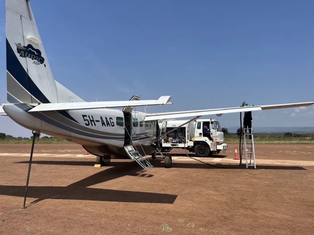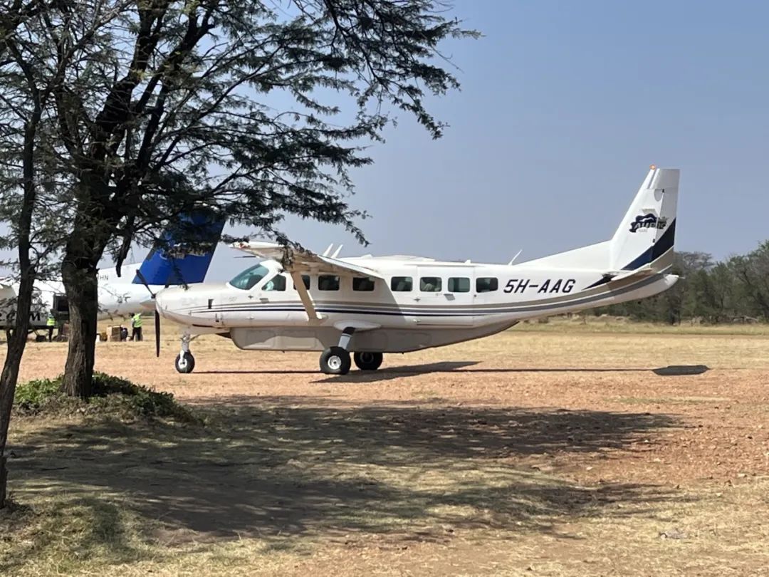 飞了一个小时,它看起来要降落了。这很神奇,因为我很确定下面的不是乞力马扎罗机场。把我们赶下飞机之后,看到一个人踩着梯子开始在飞机翅膀上拧螺丝(他最好是在例行检修而不是维修)。