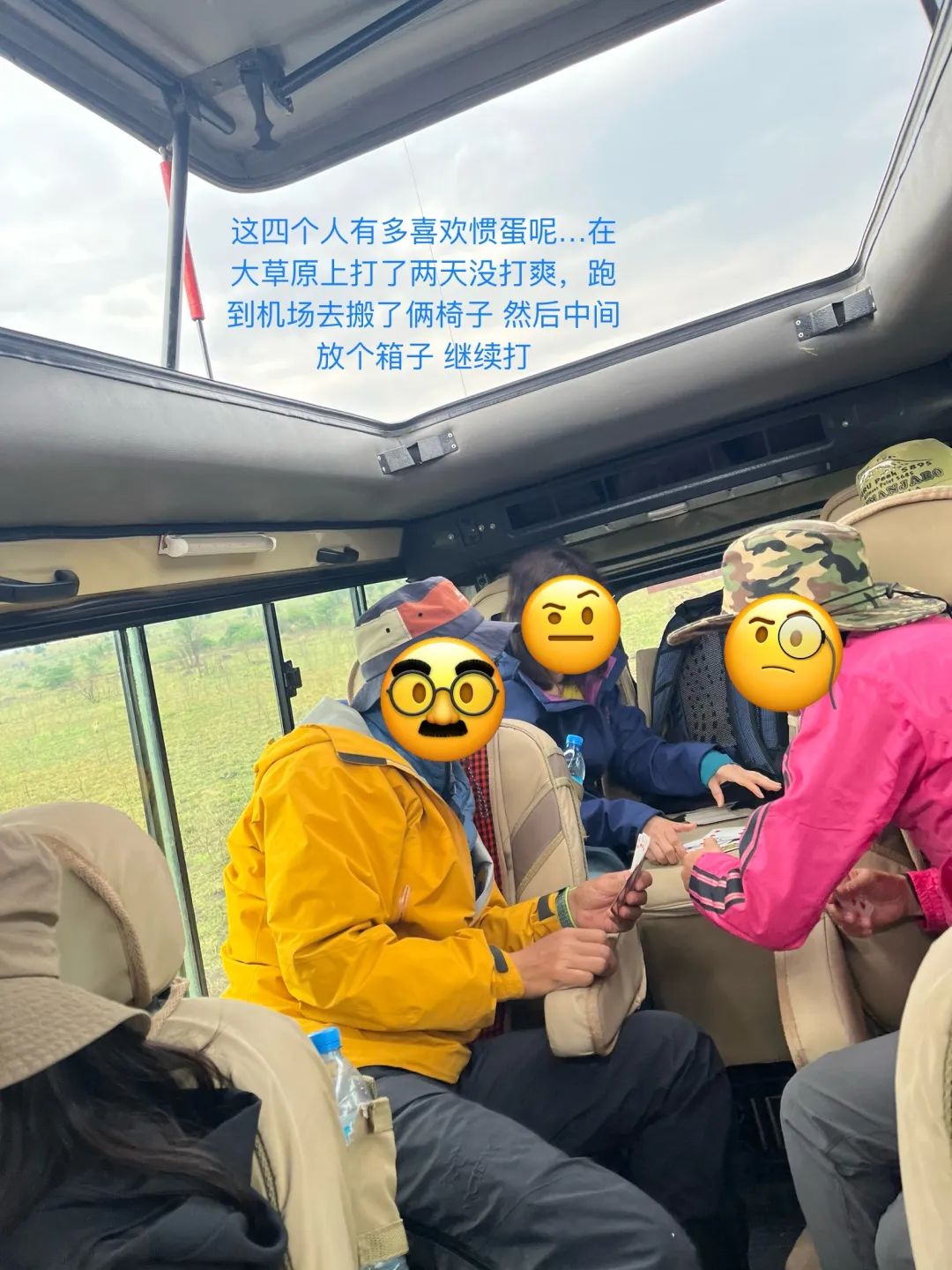 第四天在塞伦盖地北部,我们一大早就出发去河边等角马过河。这群角马明明就在河边了,但迟迟不愿过河,不知道是不是昨天刚下了雨今天太冷了,水温不合适。但是这玩意我们急也没用,于是车里30岁以上组在打掼蛋,30岁以下组在刷手机,还有一个向导坐在前面守着对讲机呱啦呱啦地打听哪里还有角马可能要过河。