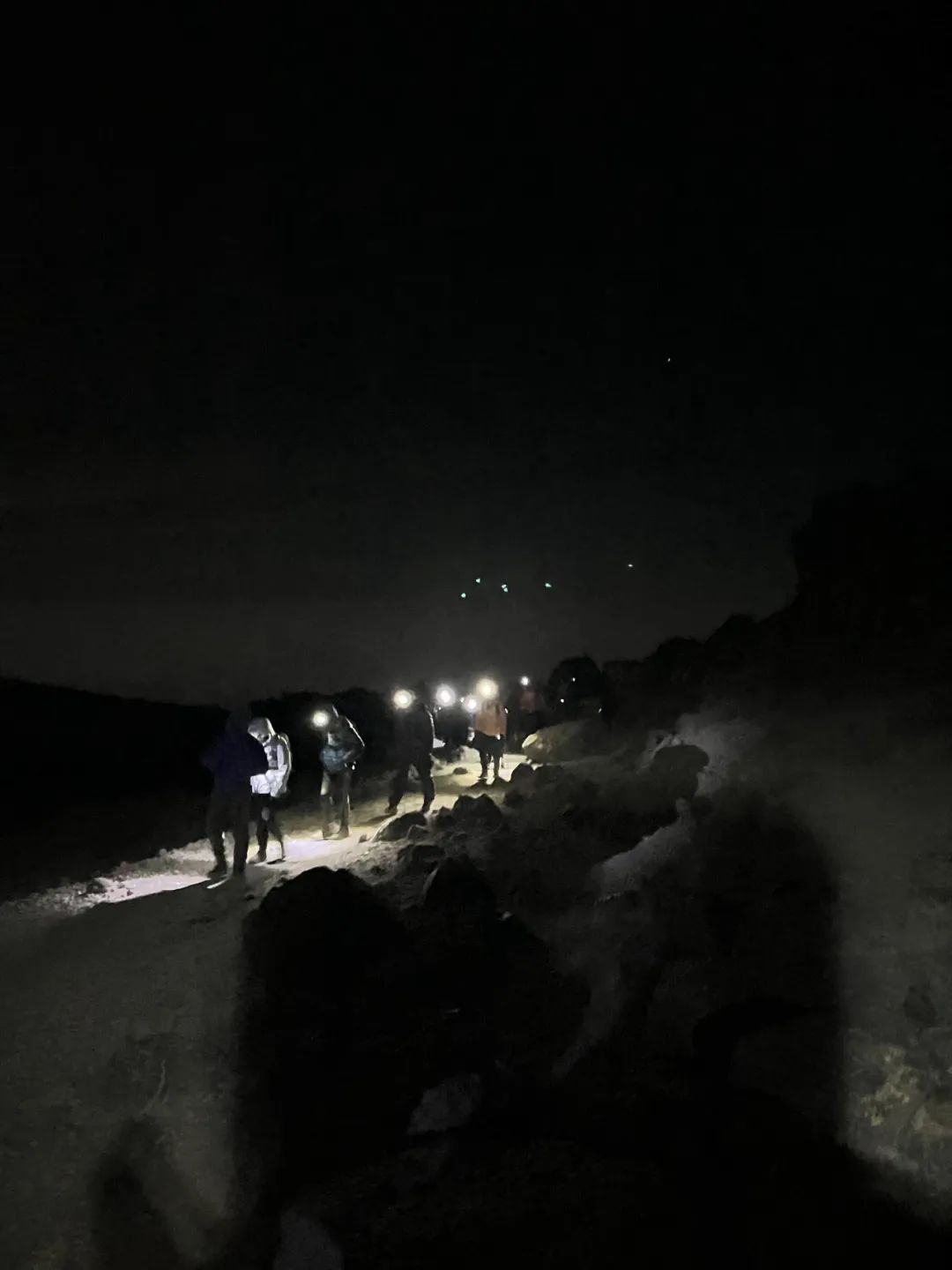 主向导看出大家都很困,穿行在队伍中大喊"don't sleep don't sleep"(不要睡不要睡), 又在每个人经过他的时候对着我们喊“super”“you’re a hero”(超棒,你是个英雄)等等鸡血语言进行鼓励式唤醒(但无效)。