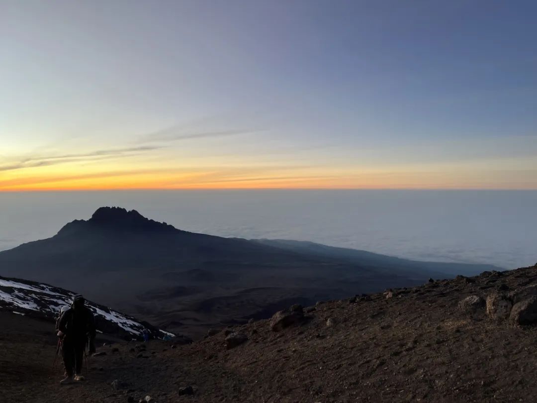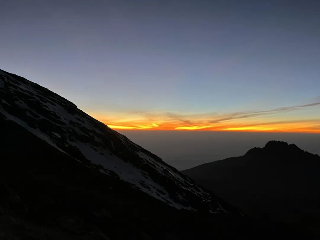 天边有一丝橙色的光挂在地平线上,意识到按照向导的“完美节奏控制”,应该快登顶了,果然看到不远处好像有个豁口,向导说上去就是Stella Point,于是加快速度连超两队人跑上去看日出。