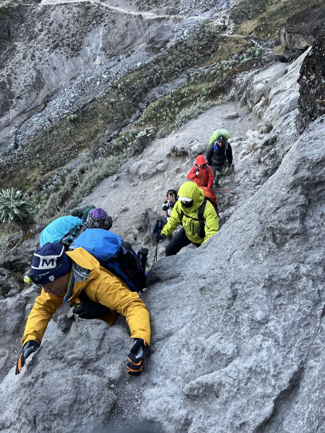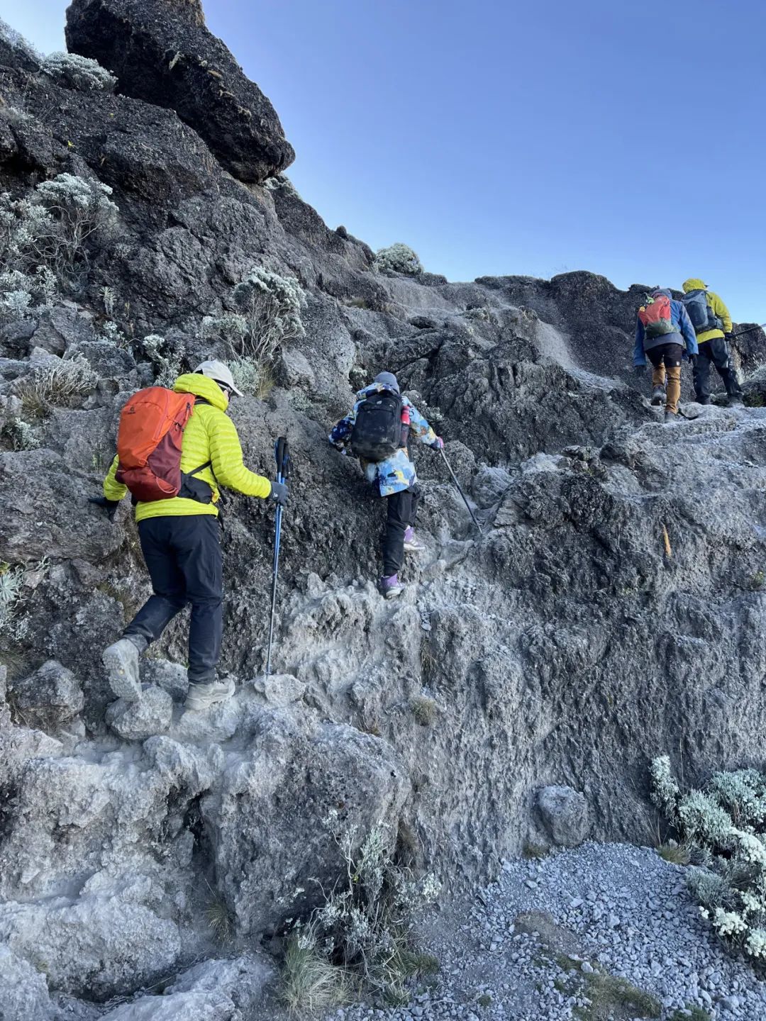 第四天要翻过Barranco Wall,有些地方很窄,要贴着岩壁走,或是手脚并用爬石头。为了避免"堵车",我们五点起床,六点出发。