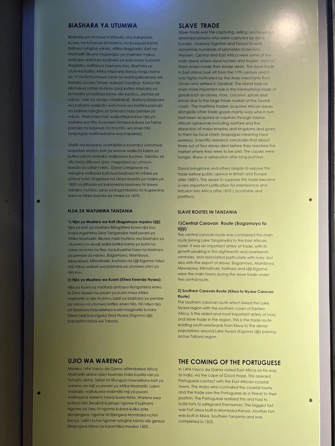 纪念馆主要讲的就是坦桑尼亚历史:从1494年葡萄牙人Vasco da Gama在去印度的路上途经东非,到后来帝国主义殖民、瓜分非洲和黑三角贸易,再到在Julius Nyerere的领导下尝试摆脱英国的统治并在1961年12月9日独立和阿鲁沙宣言(Arusha Declaration)。纪念馆没什么文物,全是大段的文字陈述,直接梦回几个月前在学校学ap世界史的痛苦。