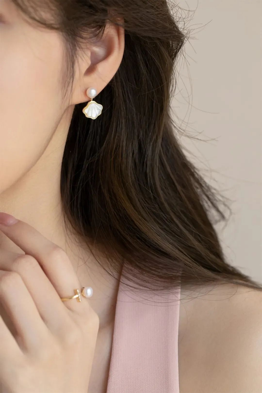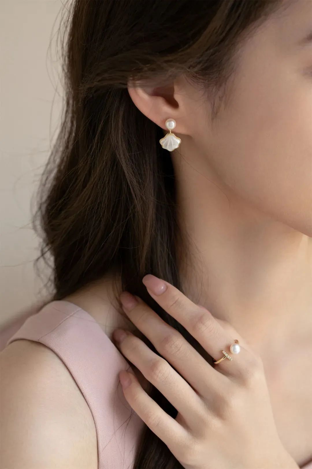 和淡水珍珠相互呼应,犹如夏日海边的贝壳风铃摇曳动人,佩戴起来如心中的白月光清冷高级。