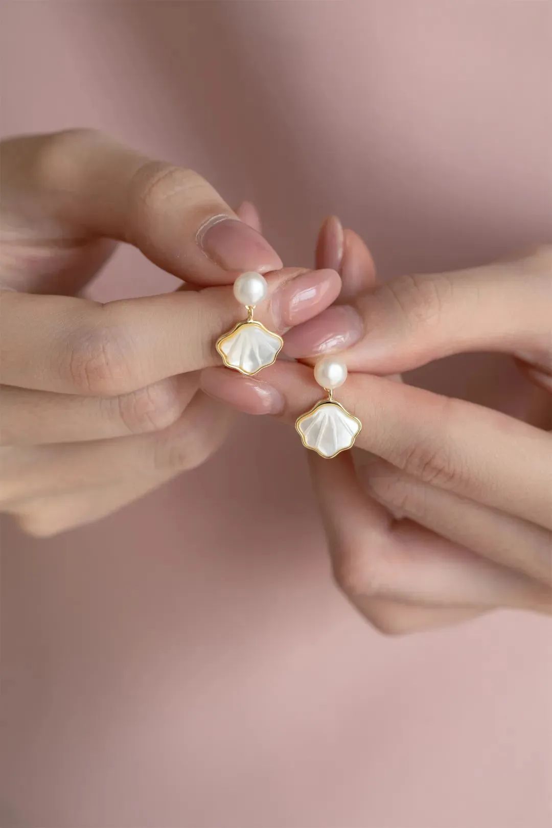 小贝壳选用深海白蝶贝贝母镶嵌,14K金包边,光彩如月光自然动人。