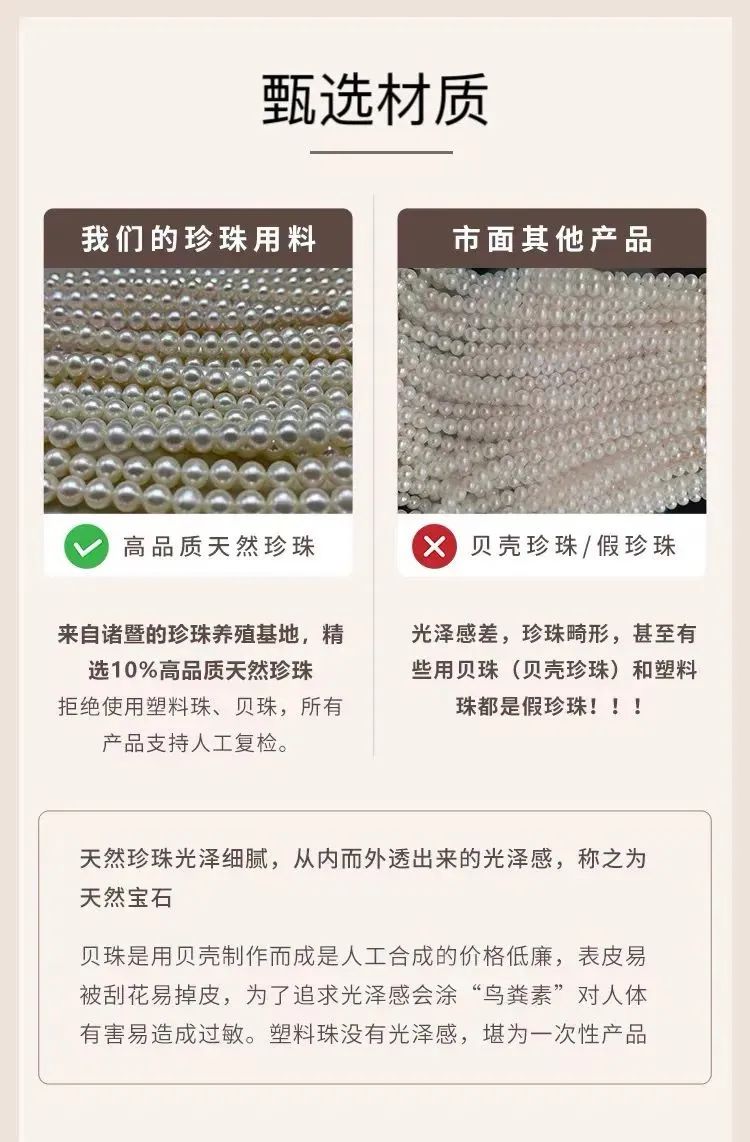 颗颗精挑细选,即使珍珠价格月月飙涨,依旧坚持使用天然淡水珍珠,拒绝没有灵魂的低价贝壳珠/假珍珠。