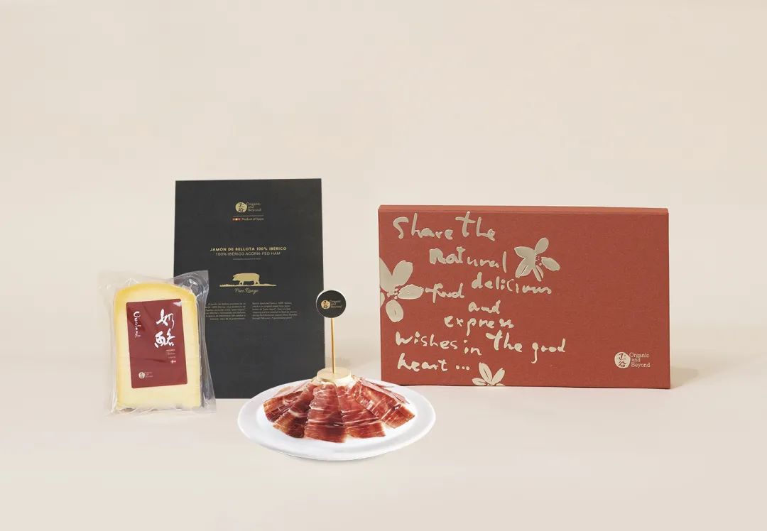 礼盒搭配两款来自正谷标准环球农场产品:来自西班牙的正谷100%伊比利亚火腿,选择生长期间取食橡果的纯种黑毛猪,经过长时间的熟成窖藏,形成了这种难得的美味。正谷Ouroland有机奶酪来自丹麦,日德兰半岛牧场自由散养奶牛所产牛奶,经过数月的熟成,形成这种带有微咸海风味道的佳品。