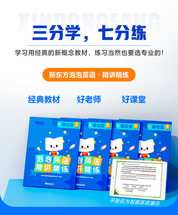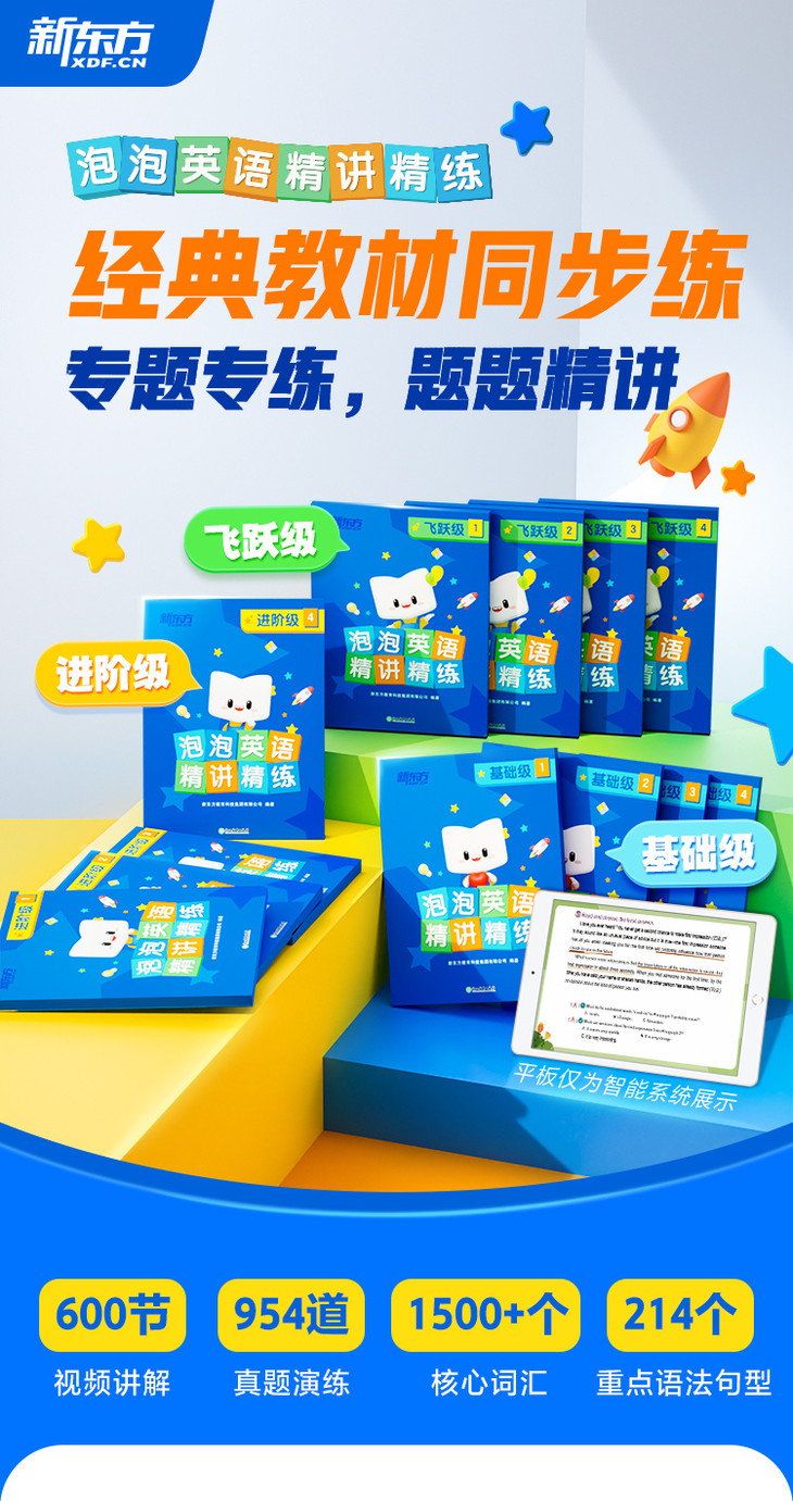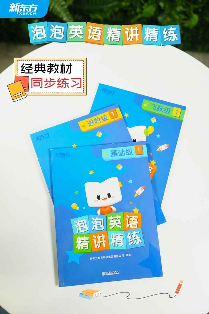 今天家长们再也不用愁啦!新东方今日推出新概念经典教材同步练——《新东方泡泡英语·精讲精练》,搭配600节讲解课堂,专题专练,题题精讲,学到哪练到哪,让孩子学习再也不掉队!学英语,你可以永远相信新东方!