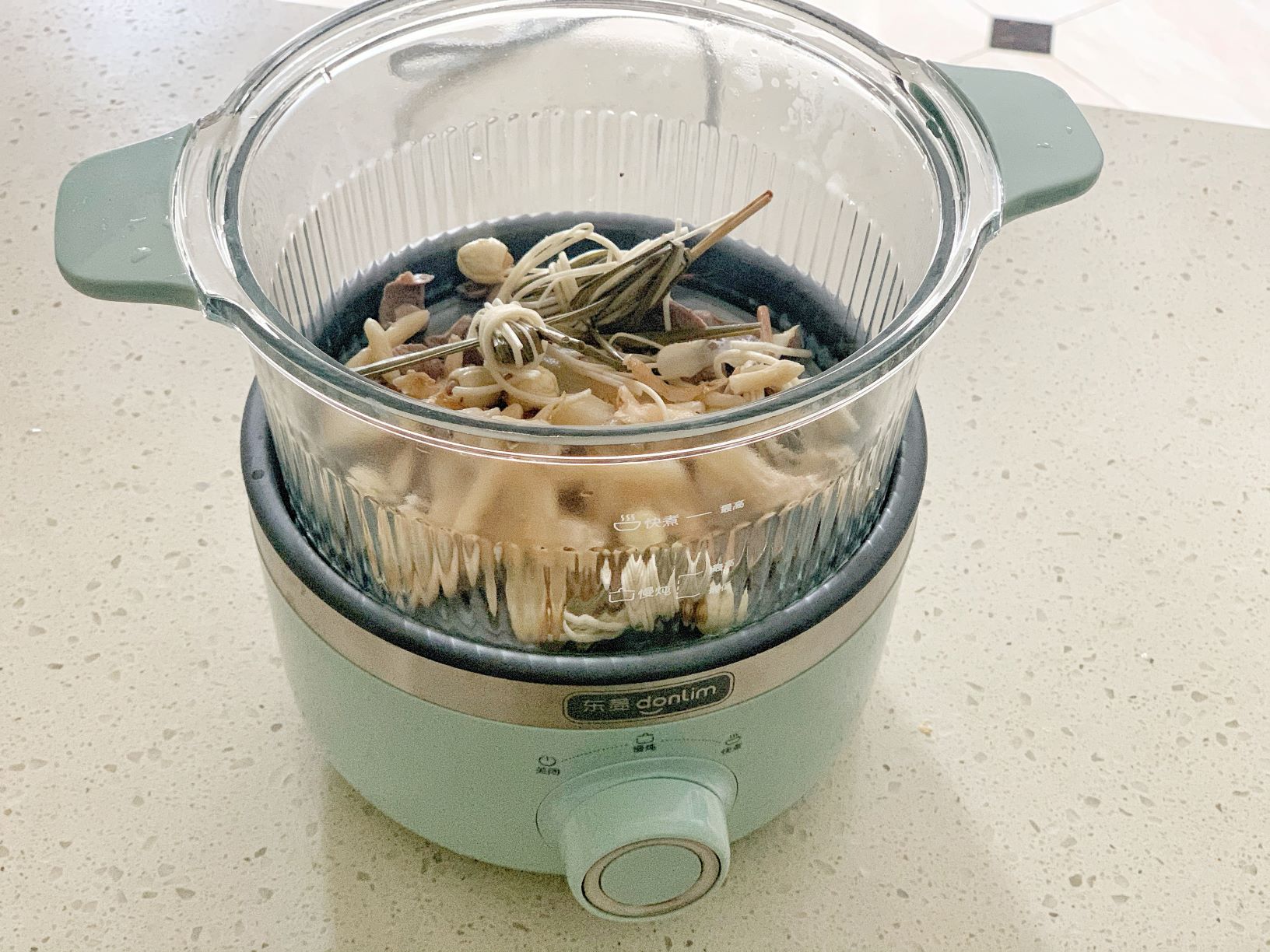5. 加水至快煮最高水位线,开快煮档,开锅后转慢炖键1.5小时