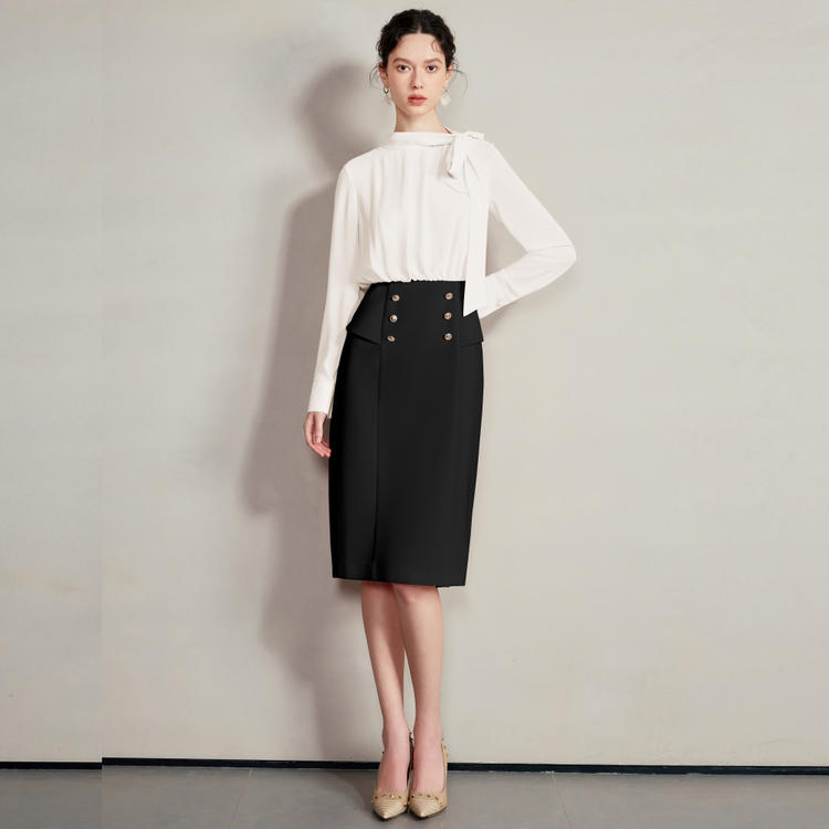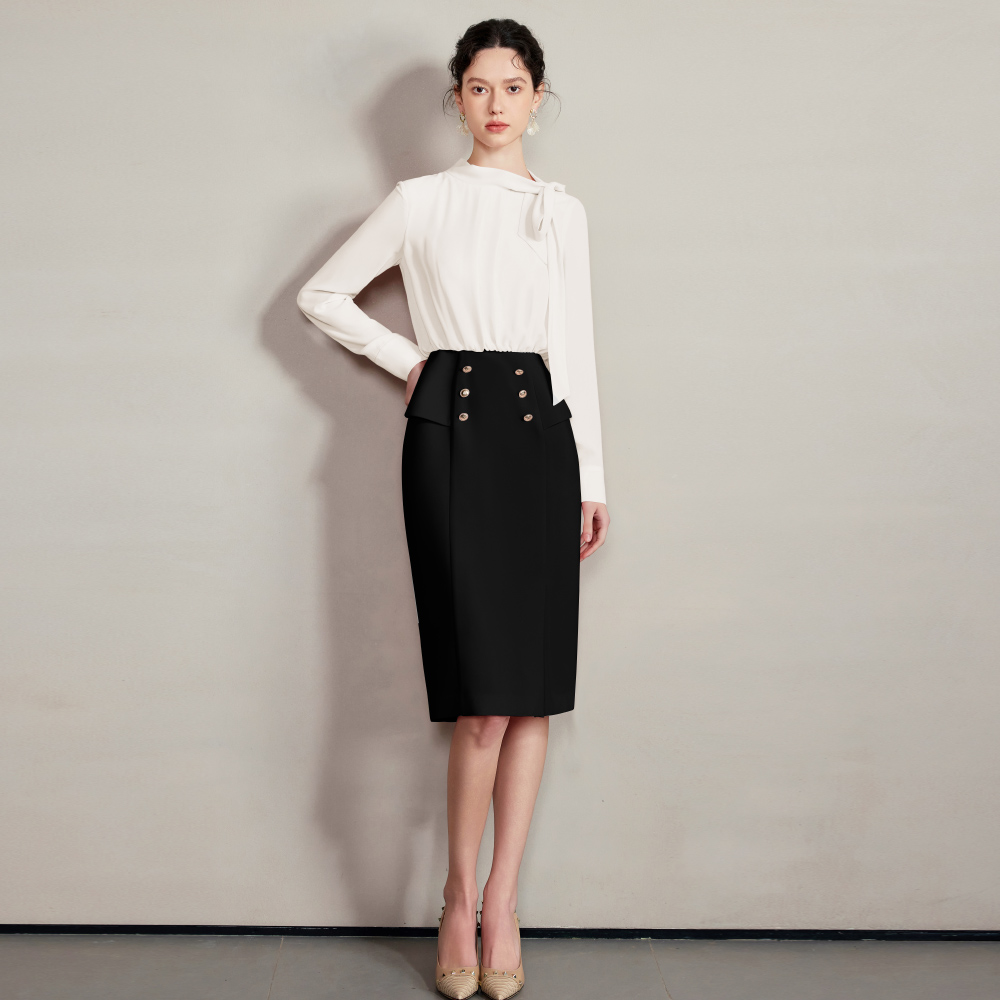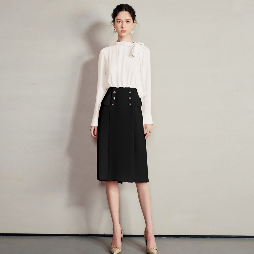 假两件设计堪称点睛之笔。高腰版型,巧妙拉长腿部线条,轻松打造黄金比例。金属纽扣整齐排列,是低调的华丽,彰显着独特品味。裙身线条利落流畅,行走间尽显端庄大方~