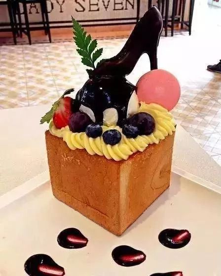 店里的招牌蓝莓凯莉风(蜜糖吐司)居然在吐司上放置着一只巧克力做的“高跟鞋”,你不得不赞叹甜品师的精湛技艺。