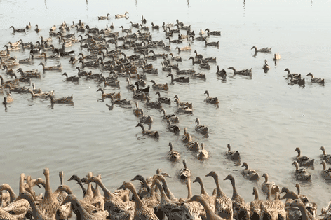 鸭子一点儿都不挑食,农家的稻谷、玉米,湖里的虾螺、水草都爱吃!