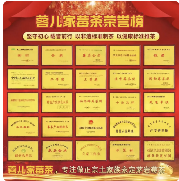 胡蓉传承[土家贡茶]的种茶选茶标准,结合现代制茶工艺,倾力打造让老百姓都喝得起的珍硒好茶一一胡蓉家莓茶。[胡蓉家莓茶]来自世界硒都,湖南永定,属土家族自治县,位于神秘的北纬30°,与东经110°交汇处,巍巍武陵山脉腹地。因凤凰降临于此而得名。这里深山绵延不绝,山清水秀,自然风光奇特秀丽,空气清新到使人陶醉。婉如“人间仙境”,是人与自然和谐共融的生态家园,更是身体与心灵渴望栖归的养生天堂。这里富硒含量均值为198PPM,最高达7188PPM。得天独厚的原生态自然环境,世界硒都的富硒沃土,成为茶界奇珍[胡蓉家莓茶]的醉佳天地。胡蓉她说,只有在我们这种原生态环境,它的有效成分与营养价值才是最高的。好比长白山人参与其它地方的人参的区别一样。胡蓉的介绍,莓茶天生自带香气,几乎没有病虫害,所以无需打化学科技。但必须每隔30天人工锄草一次,原生态基地绝对不可以施化肥的。否则,主要成分就会快速下降。永定莓茶是国家地理标志保护产品,我们一定要保护好。【蓉儿家莓茶】的采摘标准要求非常严格,被称为特级龙须的嫩芽尖植物黄酮含量最高,营养最全面,口感、色泽上佳。