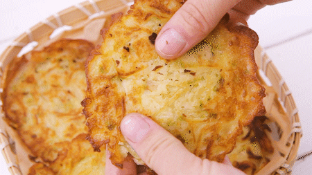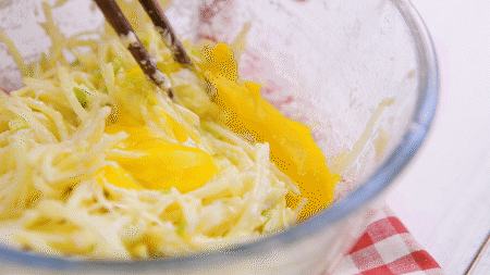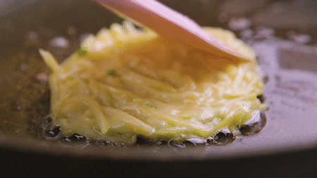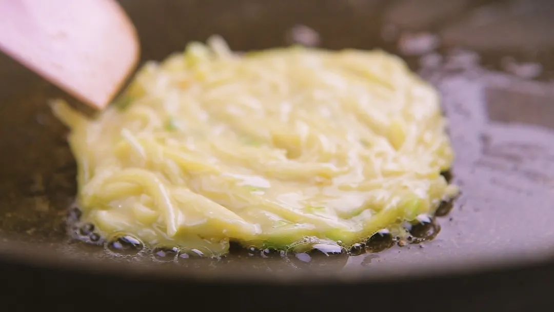 2. 切勿太大火煎,否则外面焦了,里面没熟,刚煎好的土豆丝鸡蛋饼焦香脆口,趁热吃口感最好。