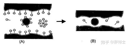 同时因为人体的皮肤是亲油的(皮脂膜和角质层都有大量的脂质成分),游离表面活性剂的亲油端附着在皮肤上,带负电的亲水端暴露在外,行程一层带负电的膜(下图 A) 。