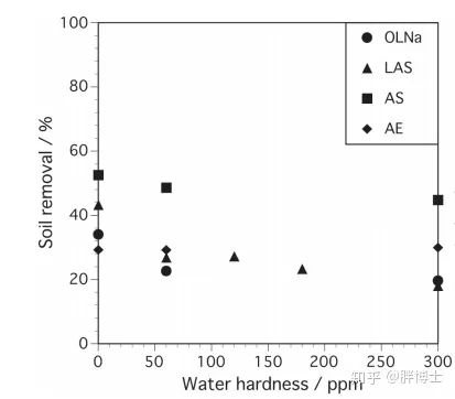 从中可以看到,脂肪酸钠(图中的 OLNa,同时也是肥皂的主要成分)的去污能力并不比其他三款合成表面活性剂强。在不同硬度的水质测试中,清洁能力基本上都是垫底。