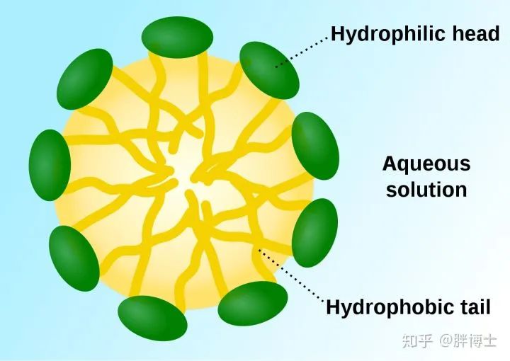所谓胶束,是在表面活性剂溶液中普遍存在的现象。因为表面活性剂有一个亲水端,一个疏水端。在相似相溶原理下,亲水端都面向水,而疏水端都逃离水。于是在溶液里面就形成了下图这样的结构,学名叫胶束。