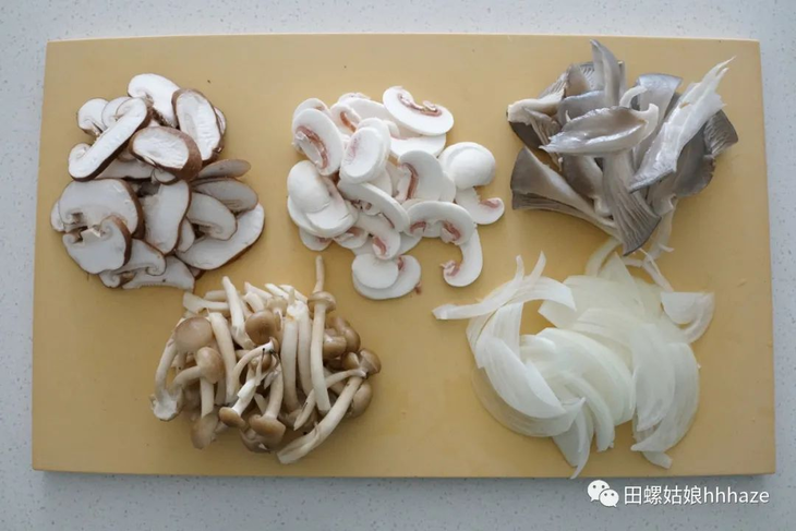 喜欢的蘑菇各2、3朵,例如新鲜口蘑、新鲜香菇、平菇和蟹味菇等等,只用其中一两种也可以;
