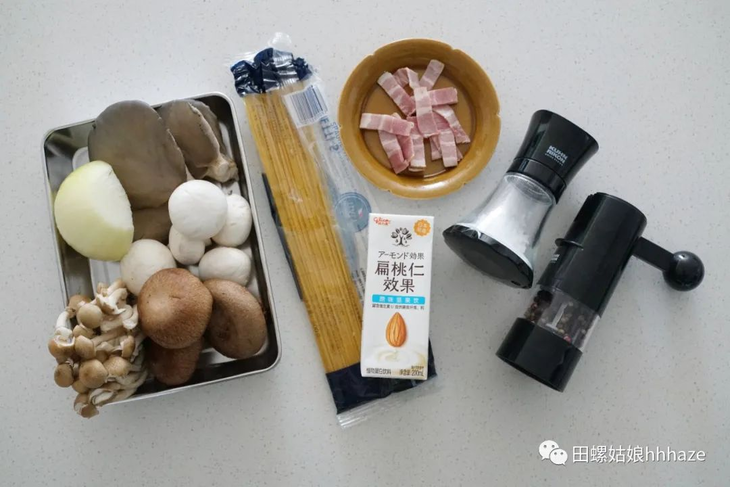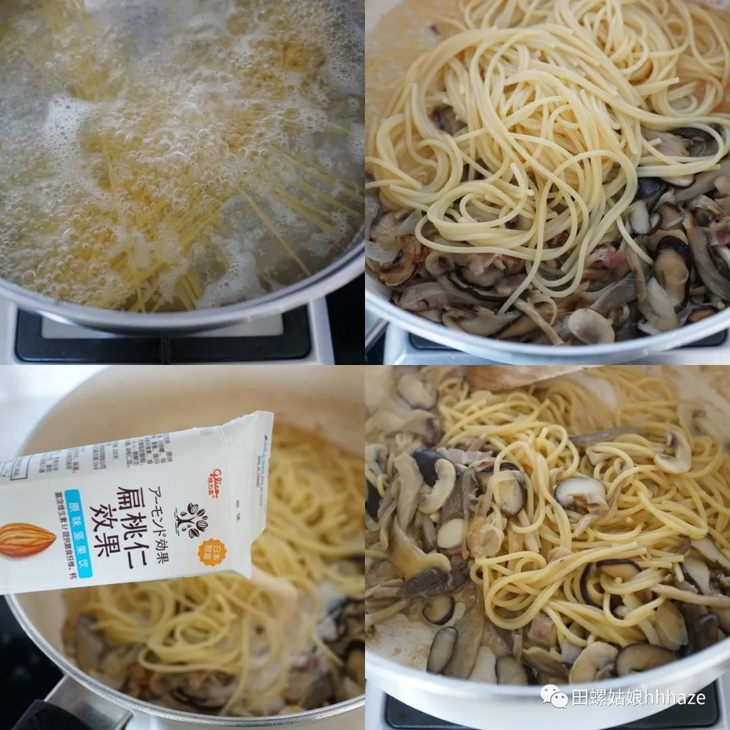 4.煮到比意面包装上的标注时间少3分钟左右,将意面和刚刚炒好的蘑菇放到一起,倒入半盒原味的「扁桃仁效果」,继续煮到收干汤汁。