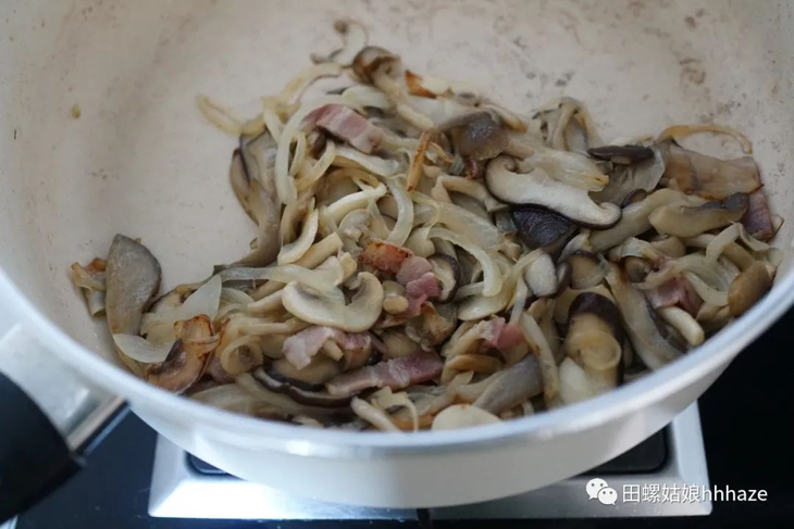 煎锅里倒2瓷勺橄榄油,中火烧热之后先放入水分比较多或者比较厚的蘑菇,再放入培根和质地比较薄的蘑菇,最后倒入白洋葱丝。