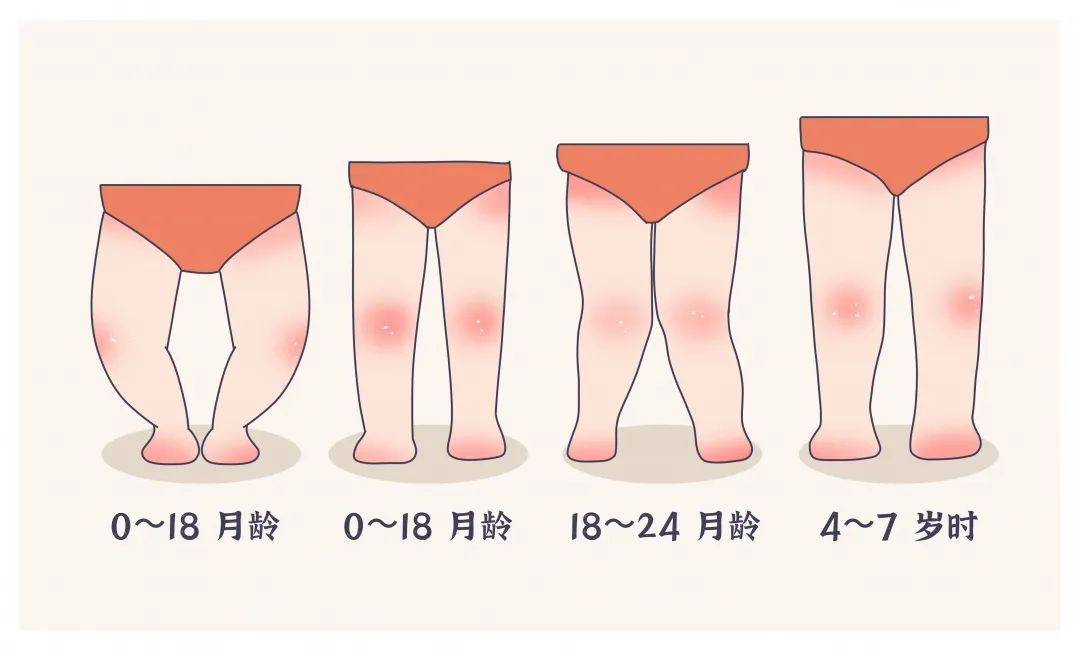 ● 2 岁以后,孩子的腿型逐渐会变得像 X 型腿,到 4 岁时 X 型腿最明显;
