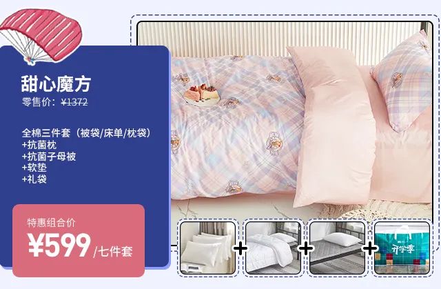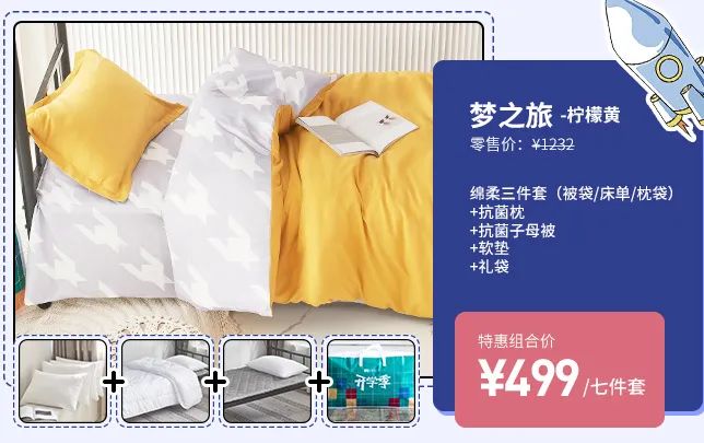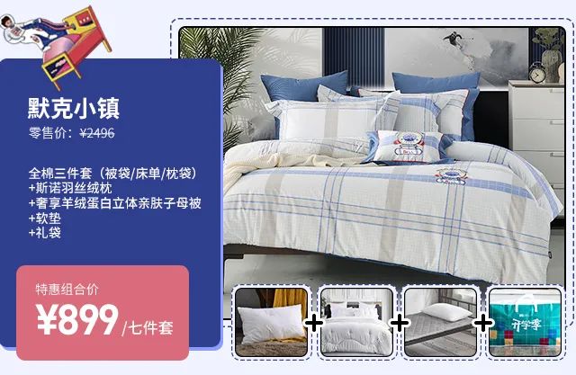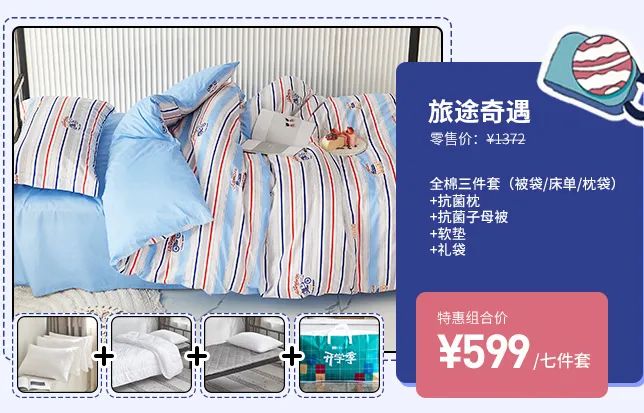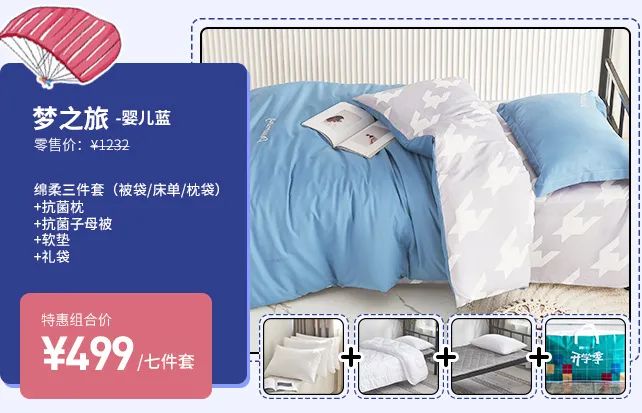 开学大礼包,有它就足够了。一个礼包包含寝室床必备的所有床品,省心省力,方便实用。