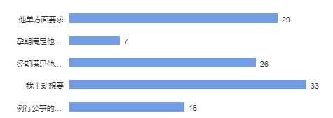 我们发现,自己主动要求、在特殊时期(经期、孕期)满足对方的人最多,其次是男伴提出的要求。