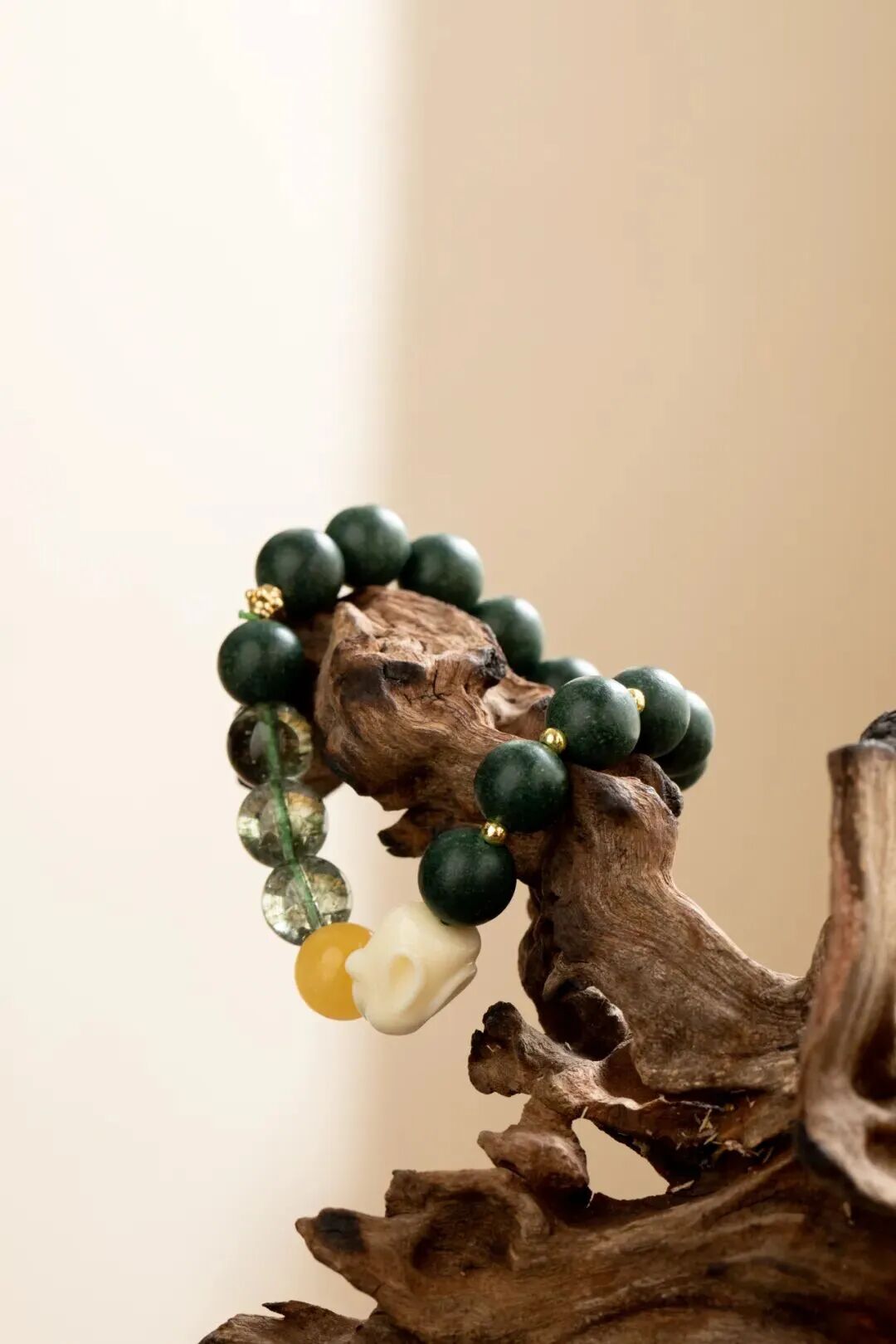 绿幽灵色水晶取其清透之意,和田碧玉温润,二者相得益彰。