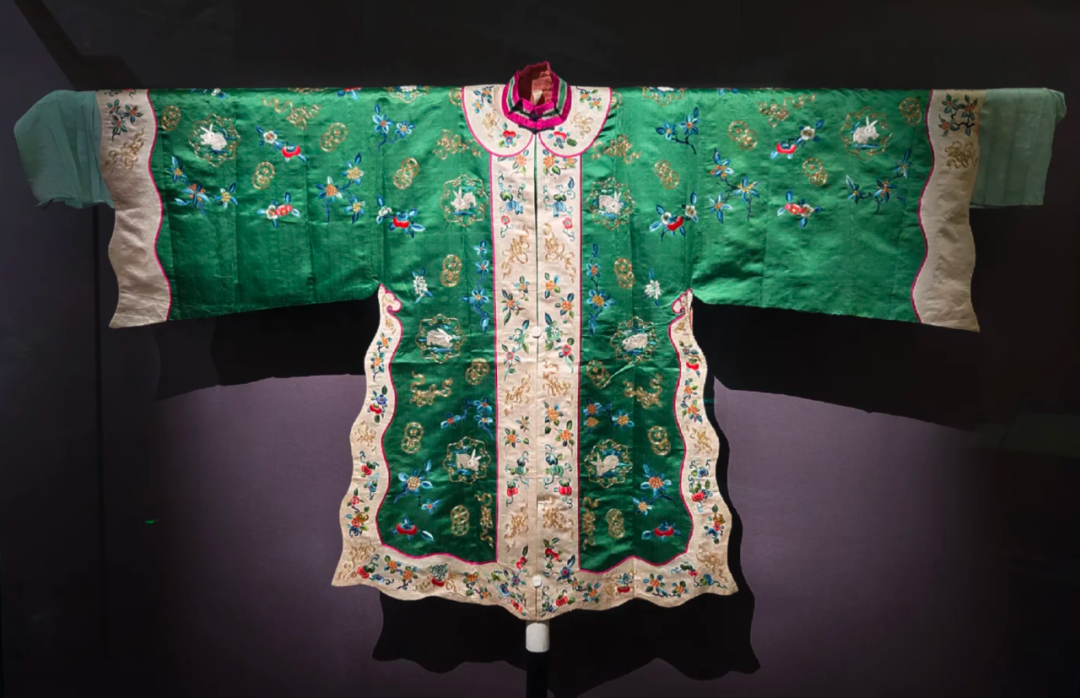 此衣为清代宫廷演剧所用,是八月花神的象征。衣上桂兔相依于金皮球花丛,绣工精巧,充满神话般的浪漫色彩。