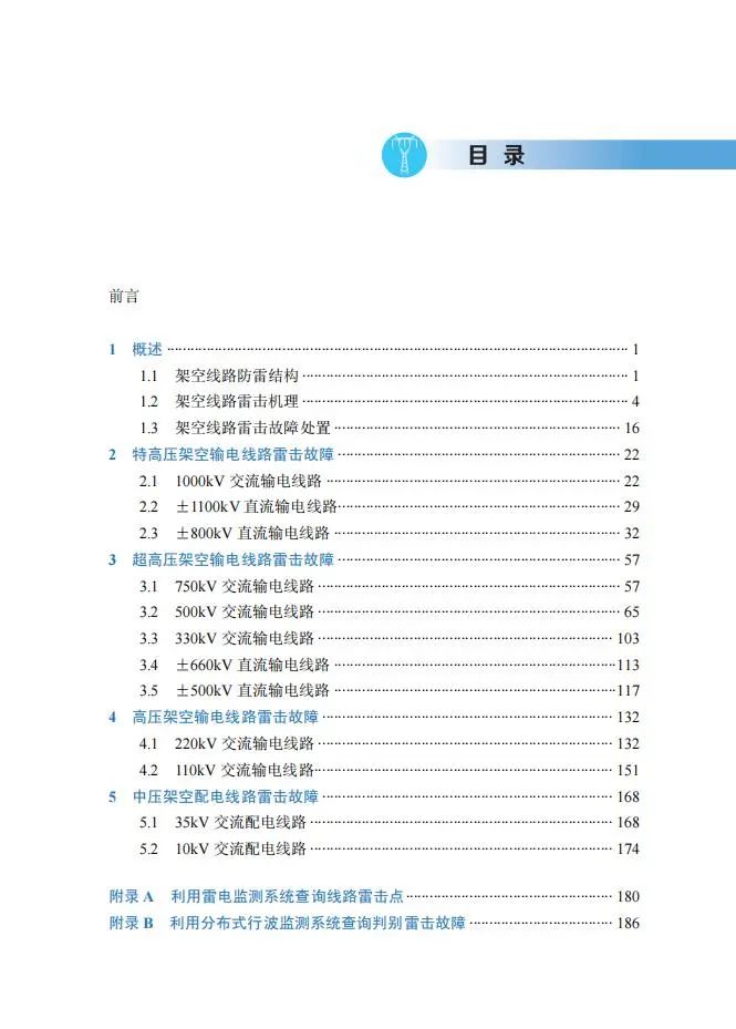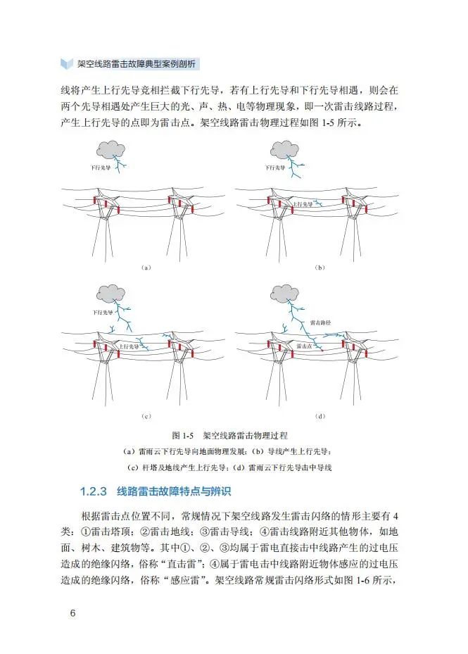 第1部分首先阐述了雷电产生机理、雷击过程、雷击表象特征、各电压等级雷击故障分类特点、雷击故障处置思想及相关手段;第2部分~第5部分分别论述各电压等级输电线路雷击故障次数、特征,主要痕迹部位及其产生的次生缺陷、隐患;除典型雷击故障外,第2部分重点介绍了特高压输电线路因分叉雷、多重雷击及长连续电流导致雷击故障的案例;第3部分重点介绍了超高压输电线路雷电绕击导线后对塔身放电、雷击多回同跳及相间故障案例;第4部分重点介绍了110kV和220kV线路各类雷击跳闸案例;第5部分重点介绍了雷电直击10kV和35kV线路各类雷击跳闸案例。