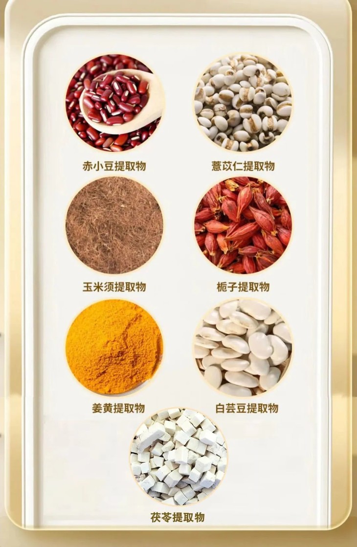 科学提炼了赤小豆、薏仁、玉米须、茯苓、栀子等7味药食同源成分,具有很好利水祛湿、消水肿作用。