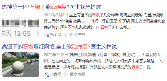 新闻上了热搜后,一波网友留言:“虽然不知道背后原理,但亲测有效”;另一波网友则大声疾呼,告诫不要随便坐被晒热的石墩子,尤其是女性不要随便去坐,否则很容易得病。