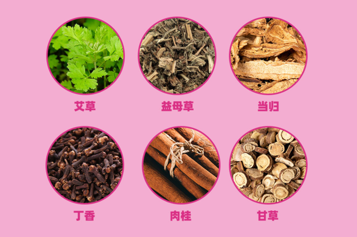 艾叶有温经散寒、祛湿暖宫的功效;益母草、当归可强化活血通经之效;肉桂有助于温阳散寒;丁香温中助阳,可治冷气腹痛;甘草则辅助补脾益气,缓急止痛。