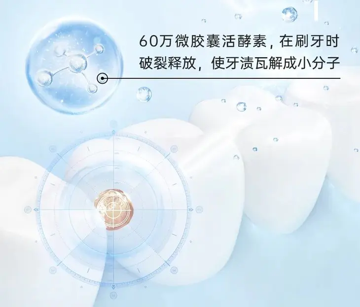 亮白小方瓶的超强洁净力主要来自60万微胶囊活酵素,刷开膏体,可看到蓝色活性酵素微胶囊破裂释放。