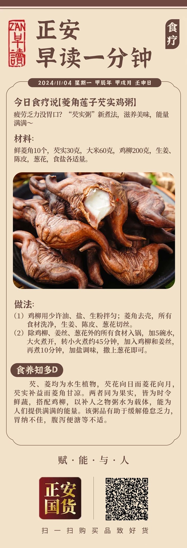 11月4日 应季食方【菱角莲子芡实鸡粥】补充能量