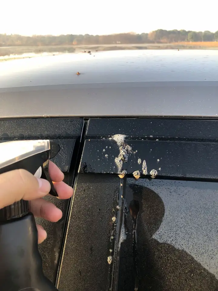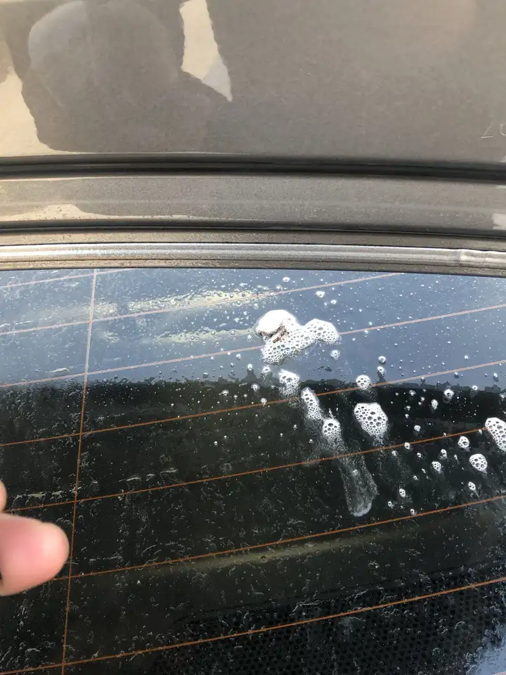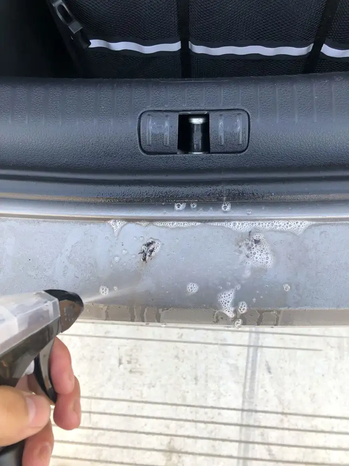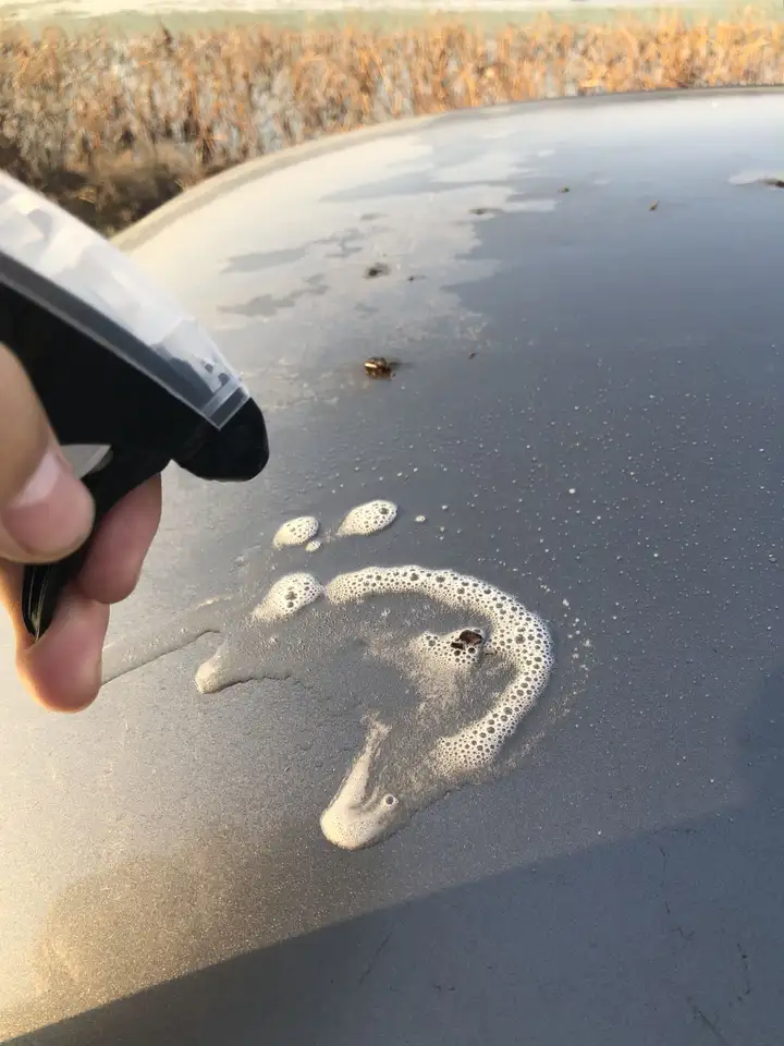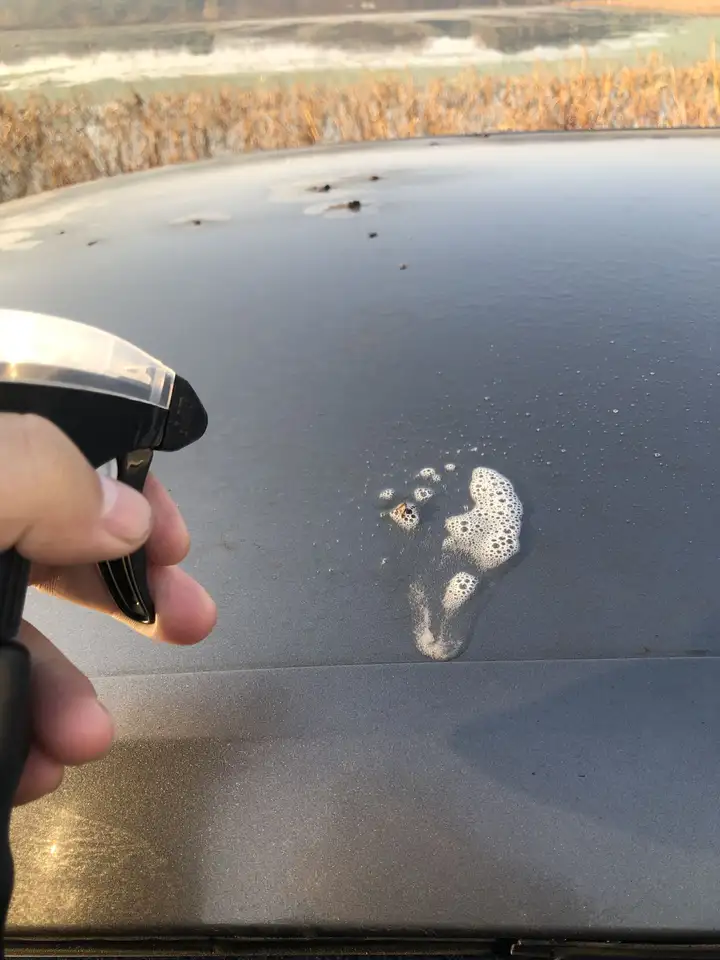 全部喷射完毕之后,先不要着急去擦拭,可以先等待一两分钟,让清洗剂去溶解鸟粪树胶。