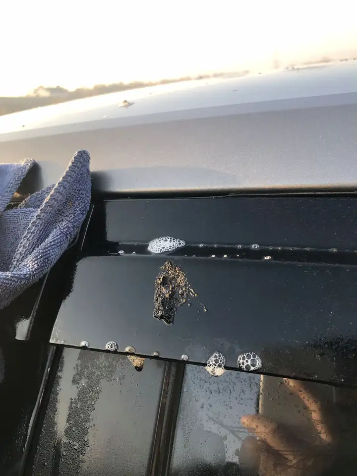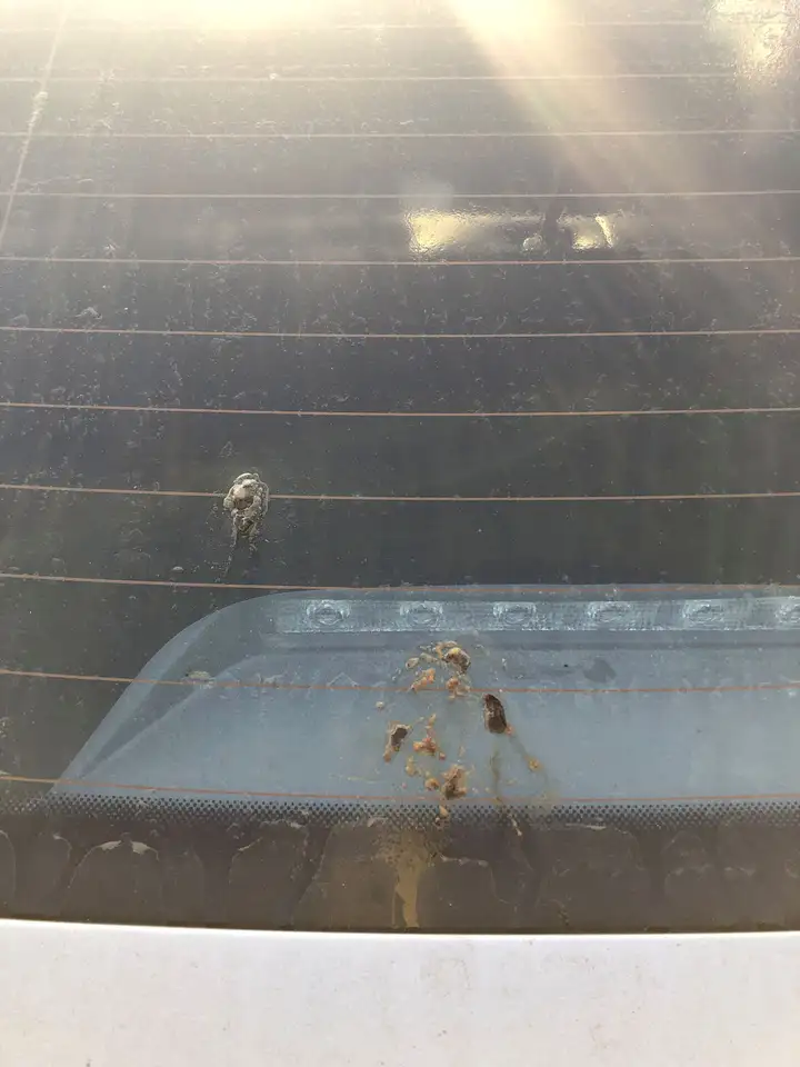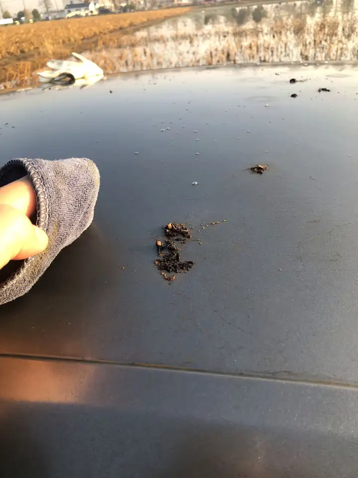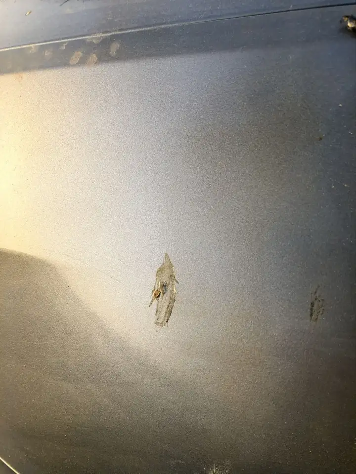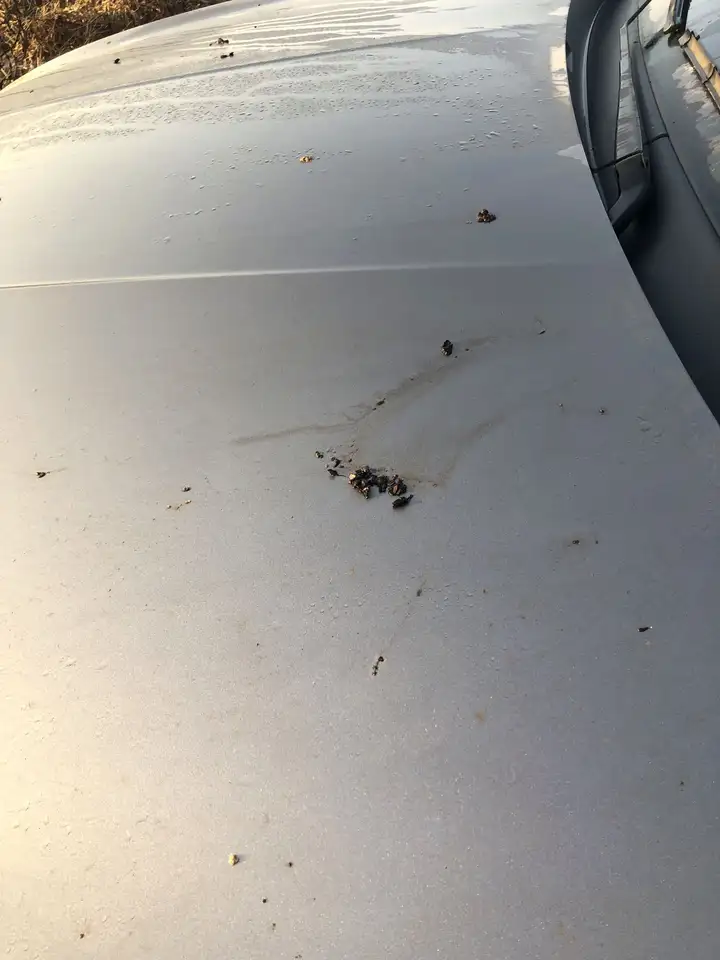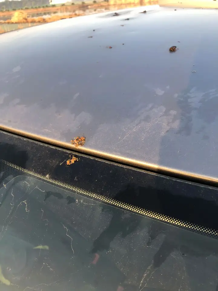 接下来用几张图片带大家看一看车子被树胶鸟粪伤害的样子,有时候我甚至以为是小鸟,故意在我车上拉“粑粑”的。