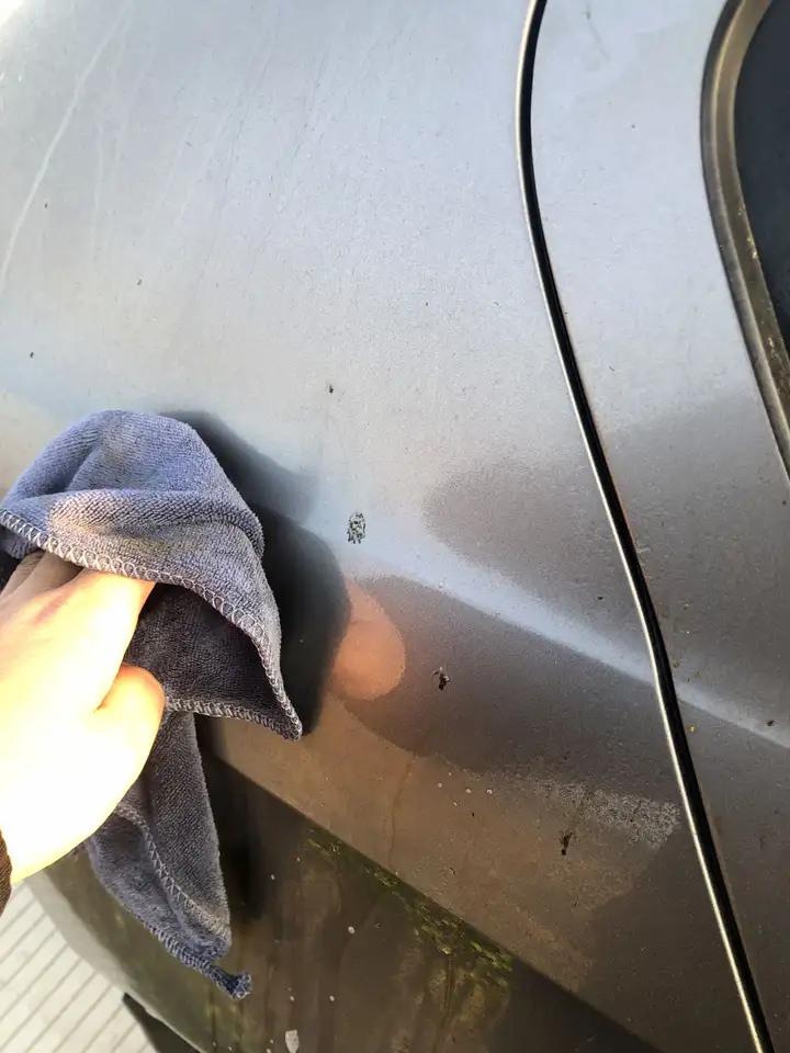 只轻轻一抹,顽固的树胶鸟粪立马就被擦车布带走了,没有鸟粪的车漆外观看起来就舒服很多了。
