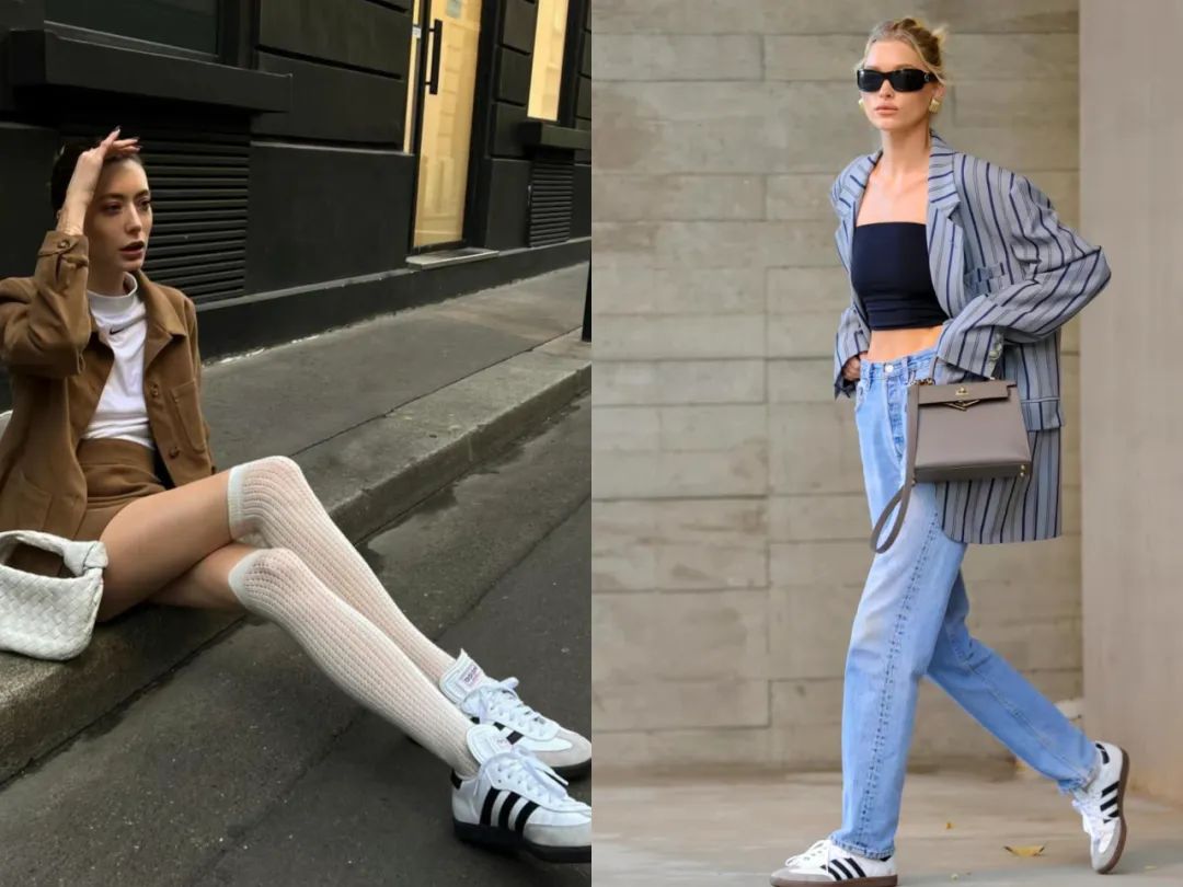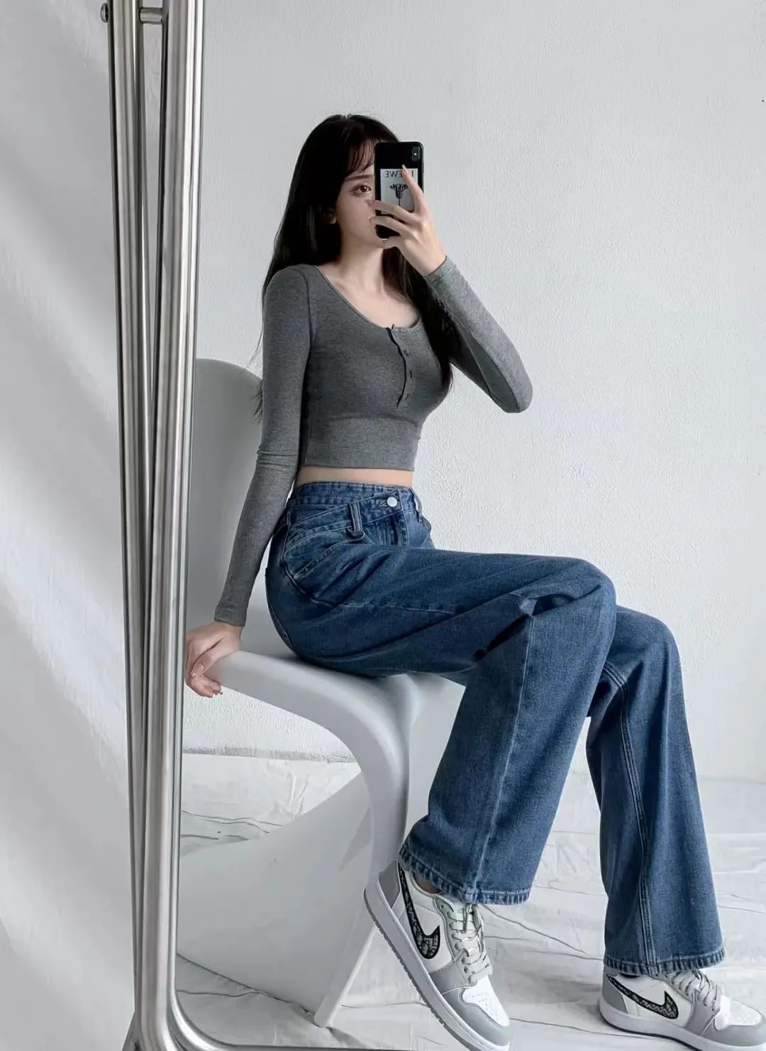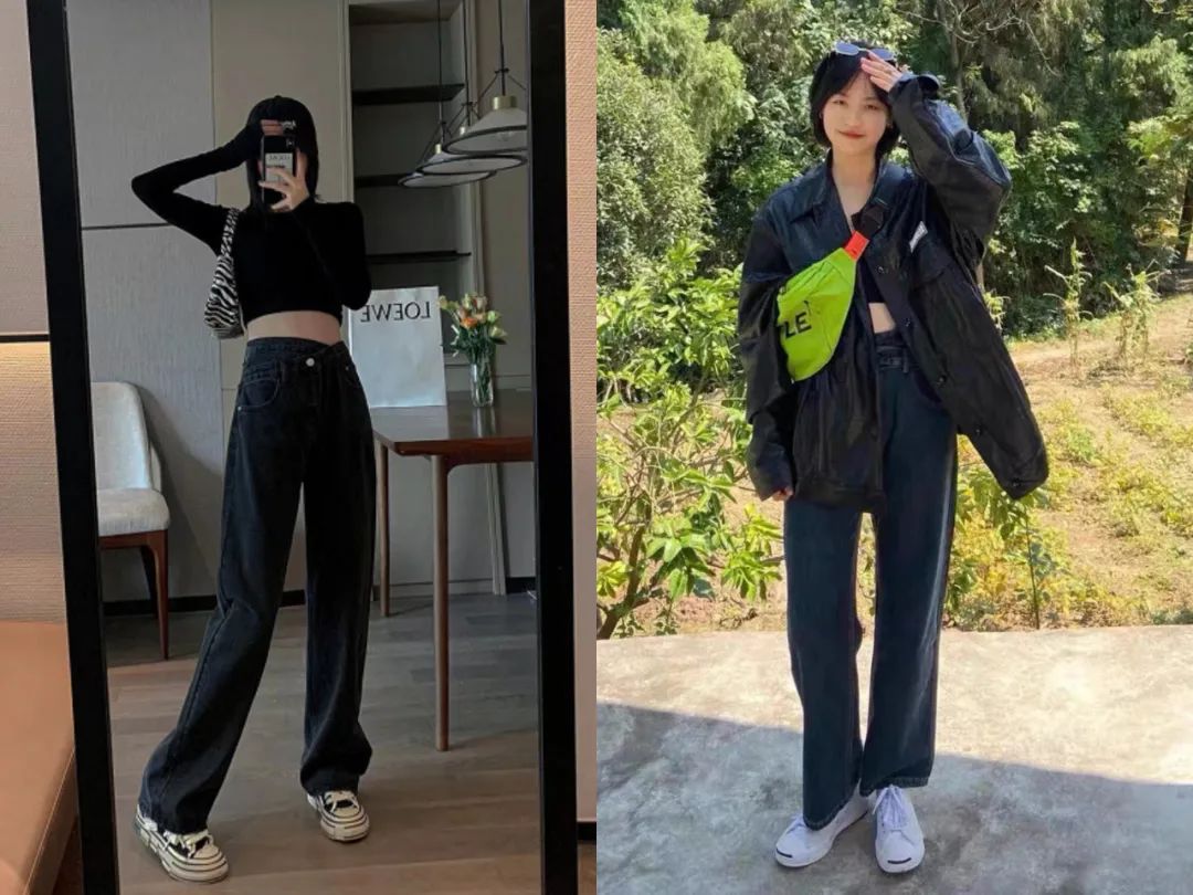 高腰交叉牛仔裤、德训鞋、撞色方领T恤,