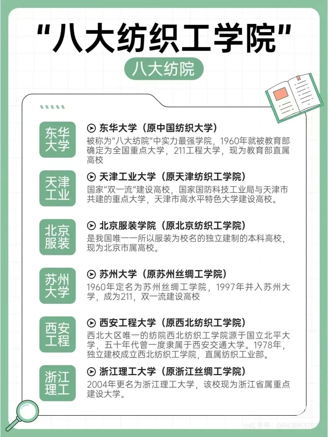 东华大学在纺织领域非常权威,其纺织科学与工程学科连续多年被评为“世界一流学科”。前身可以追溯到中国纺织大学,这个名字就足以说明一切了~