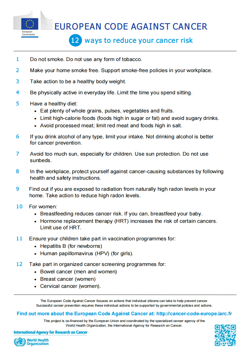 国际癌症研究机构(IARC)提醒,如果每个人在日常生活中都遵循以下12条降低癌症风险的建议,大约一半的癌症是可以避免的。