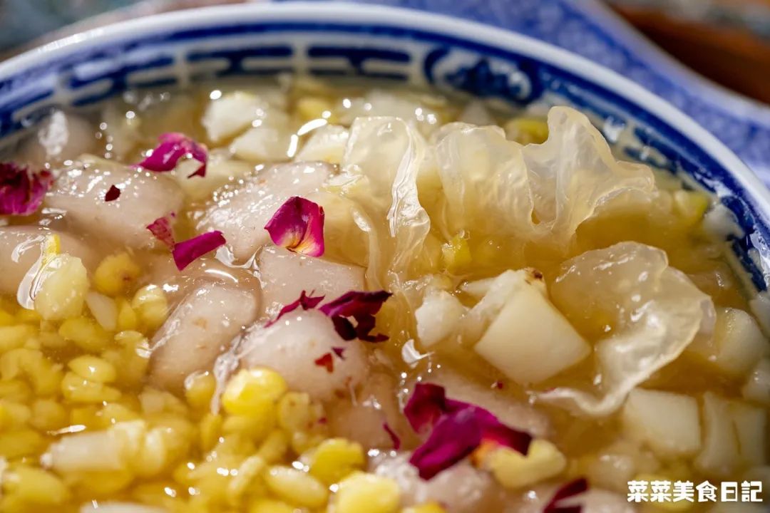老式的瓷碗里,马蹄拍打细碎,银耳透着水灵。