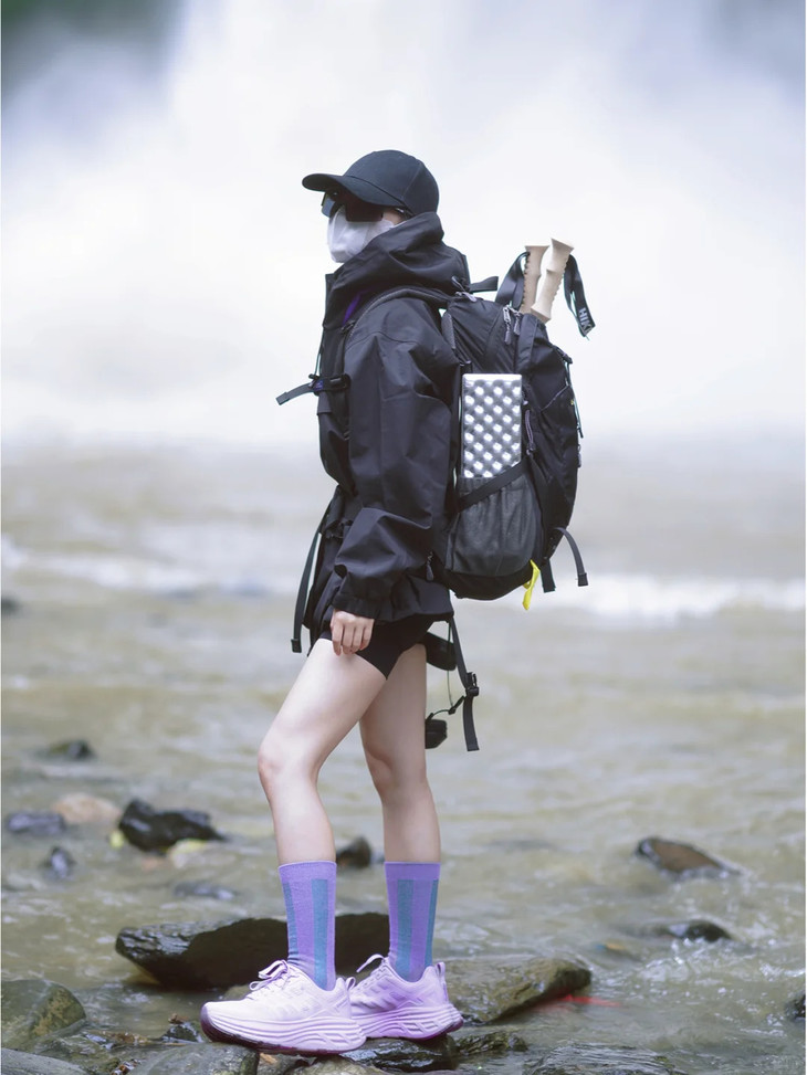 上脚很软很舒服,鞋面是防水的,出奇的是透气性也很好,踩在潮湿的路面也不会打滑,防滑性能也满足户外的需求,造型耐看,穿着它去爬青城山看瀑布了。