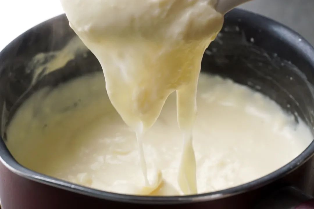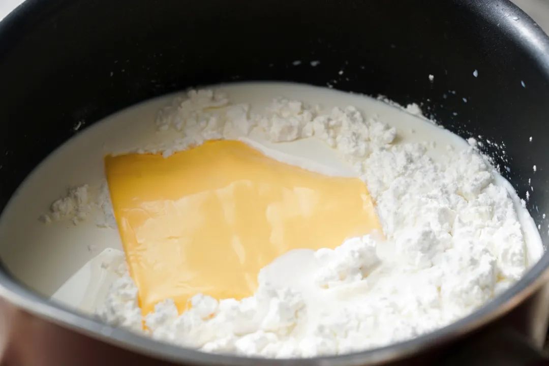 1、锅内倒入600g牛奶、50g砂糖、2个鸡蛋黄、2片芝士片和60g小麦淀粉,小火边煮边搅匀,至糊化状态。