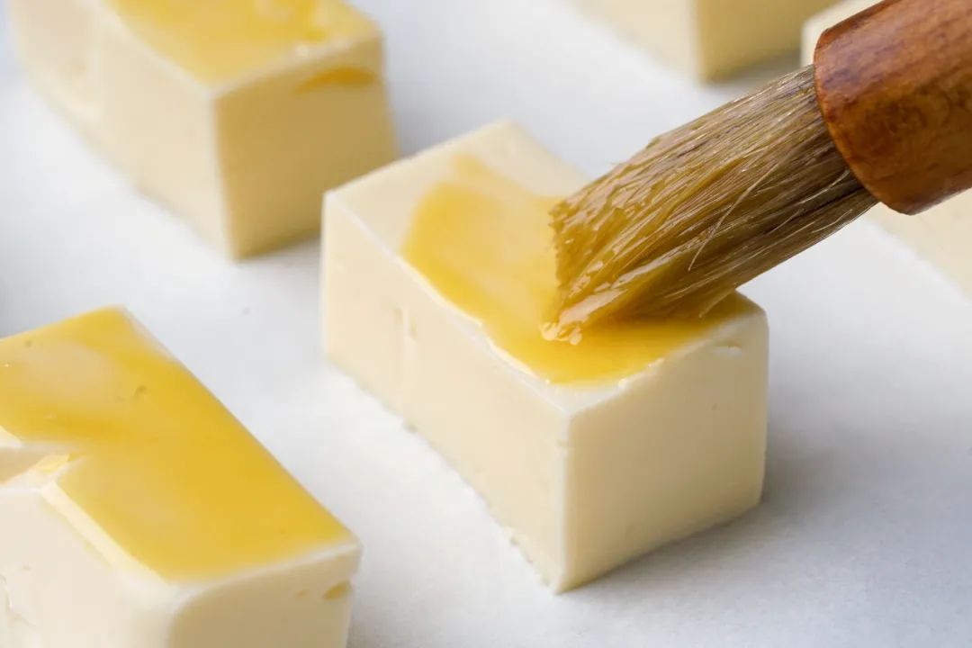 4、烤盘铺上烘培纸,将切好的牛奶块放在烤盘上,再刷上蛋黄液。