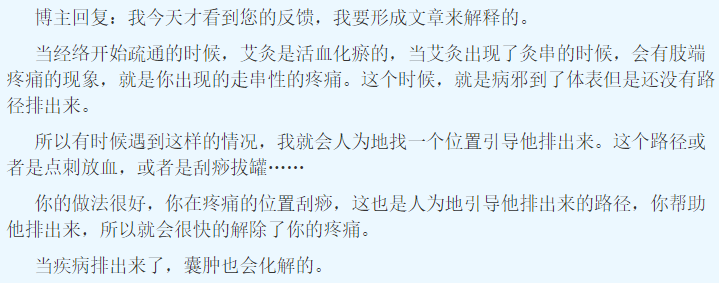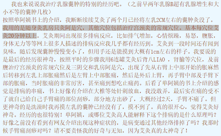 我也来说说我调理乳腺囊肿的特别的经历吧。(之前早两年乳腺B超有乳腺增生和大小不等的囊肿几枚)按照单阿姨书上的介绍,我断断续续艾灸了两个月已经将左乳2CM左右的囊肿灸没了。我用的是随身灸乳房只灸阿是穴,其他穴位包括调理宫颈炎的常规穴位。基本每穴位艾灸20分钟以上。艾灸期间出现很多排病反应,比如排气增加,心情烦躁,易怒,腹胀,身体无力等等网上很多人描述的排病反应我几乎都有经历到。艾灸到一段时间还有闻到臭味,随后发现囊肿慢慢变小了,但用手还是能摸到大概有1cm左右的样子。我要说的是最后的经历很神奇,按照平时的步骤我用6连罐艾灸后背八LIAO ,肾腧等穴位,及前腹调理宫颈炎的常规穴位及三阴交和乳房阿是穴,出现了先从右臂上中部开始的胀麻然后转移到左乳上部胀痛然后是左臂上中部胀痛,然后是外后上臂,再手臂中部及手臂下部的胀痛,当时胀痛的非常厉害,甚至痛到想吃止痛药。后看了单阿姨的书上介绍的感觉是排病的串痛,书上好像有介绍在大椎等处针刺放血,我没敢弄,最后实在痛的受不了就自己给自己手臂痛的部位刮痧,部分地方出砂了,大概经过2天,手臂不痛了。但更神奇的是洗澡时我再摸左乳的囊肿已经没有了,摸不到了。真的很开心,觉得艾灸好神奇。经历的也很特别!单阿姨,或哪位艾灸高人能解释下这个排病的是什么原理吗?好像之前没有看到有网友介绍出现这种症状的,是病变通过其他经络排掉了吗?我那时候手臂痛刮痧对吗?请不要责怪我的好奇与无知,因为艾灸真的太神奇了!