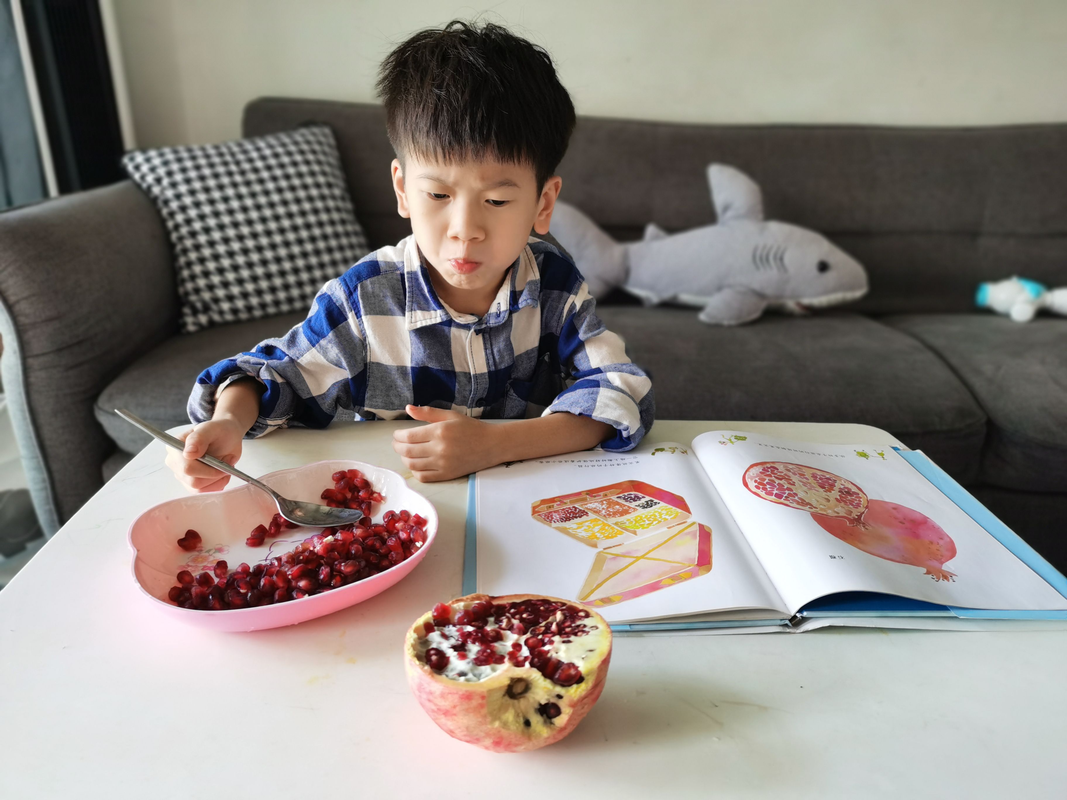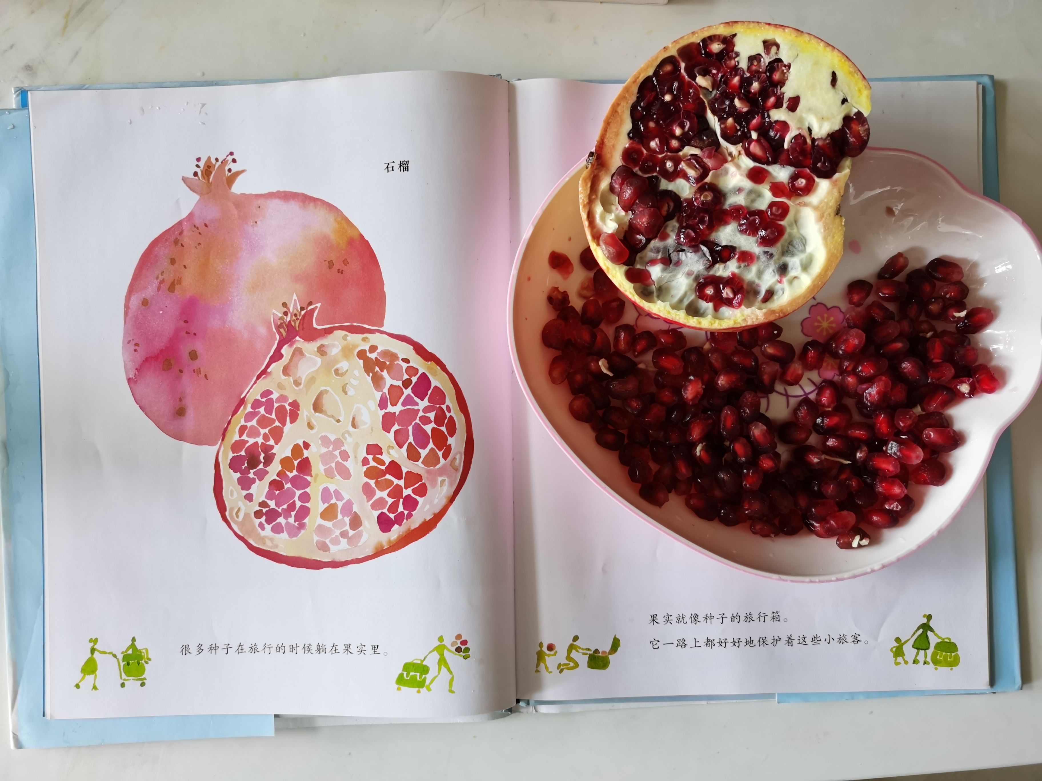 《 果实是种子的旅行箱》,今天吃石榴的时候,哥哥突然想着要看看这本书,绘本里的石榴剖面图太逼真诱人了,和真实的石榴简直一模一样,这样的科普书再来一打都不会觉得枯燥呀。