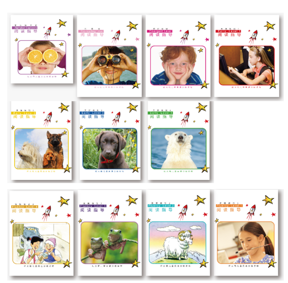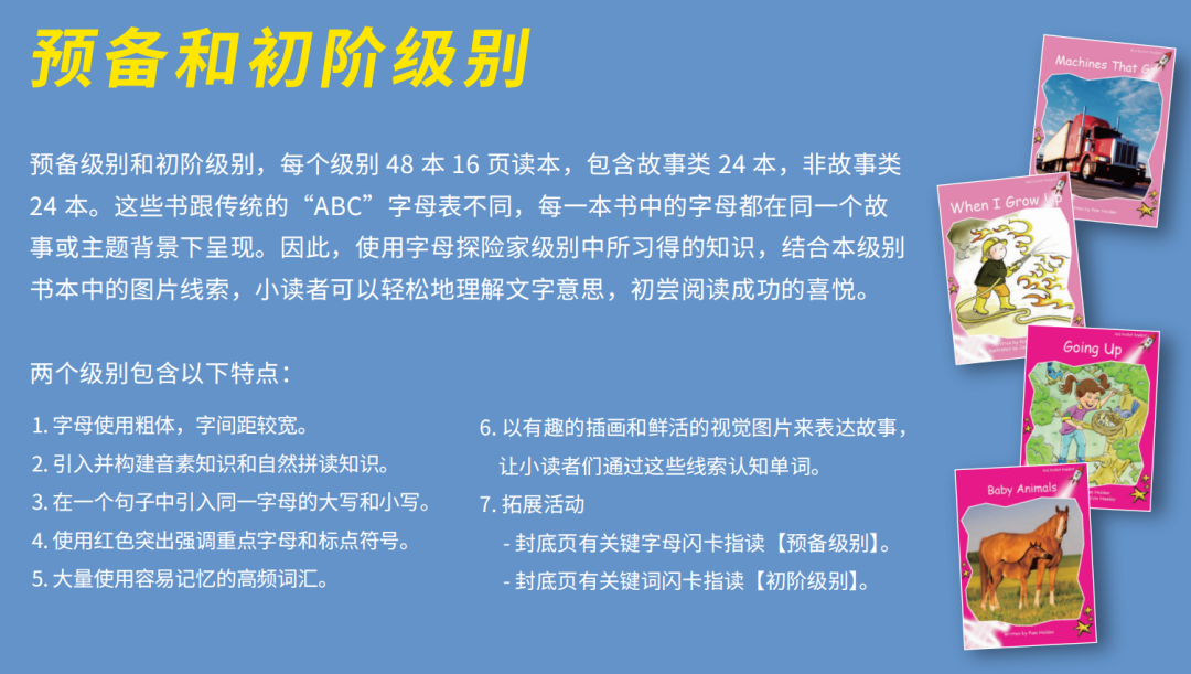 粉色--预备级别,包含故事类24本,科普类24本,每本16页,每页不超过5个单词,单本词汇量不超过80个,以学习字母发音为主。蓝思指数为 BR40L-290L。